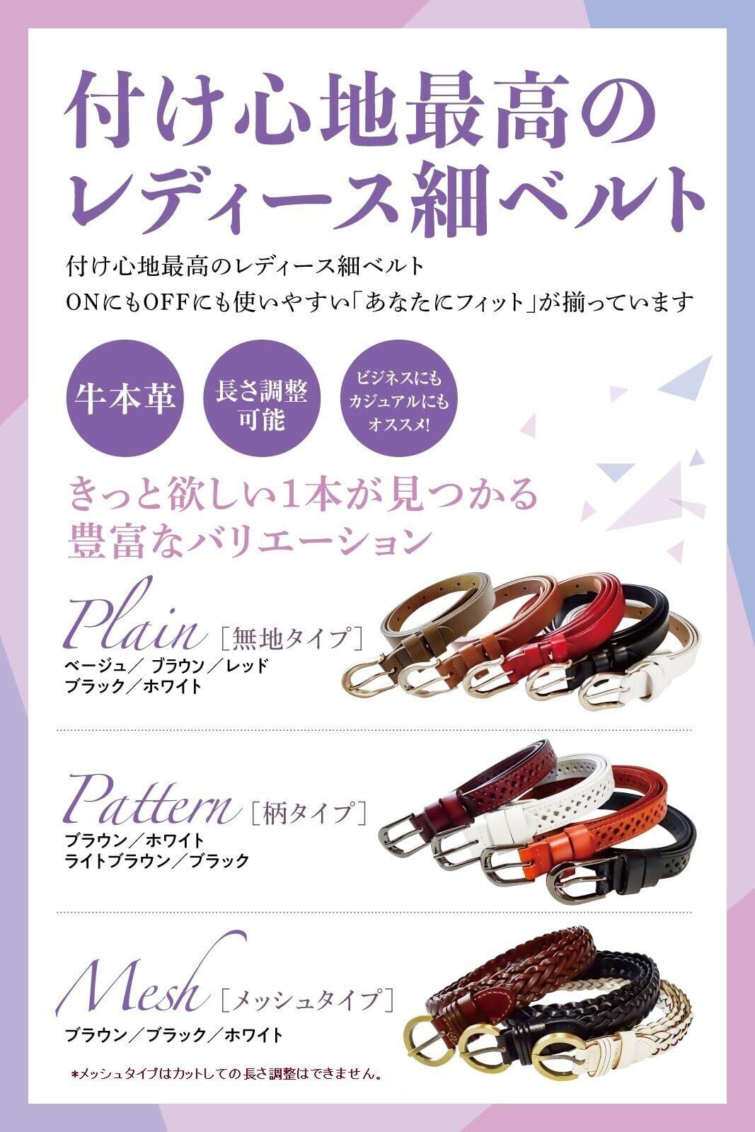 レディース細めのベルト。幅広い年齢層でご使用頂けるシンプルで飽きの来ないデザイン。無地、柄、メッシュタイプの3種類。女性らしさを引き出す牛本革の本物志向のベルトです。ビジネス、就職活動、レジャー、ゴルフにも。フォーマル/カジュアルどちらでも使えます。