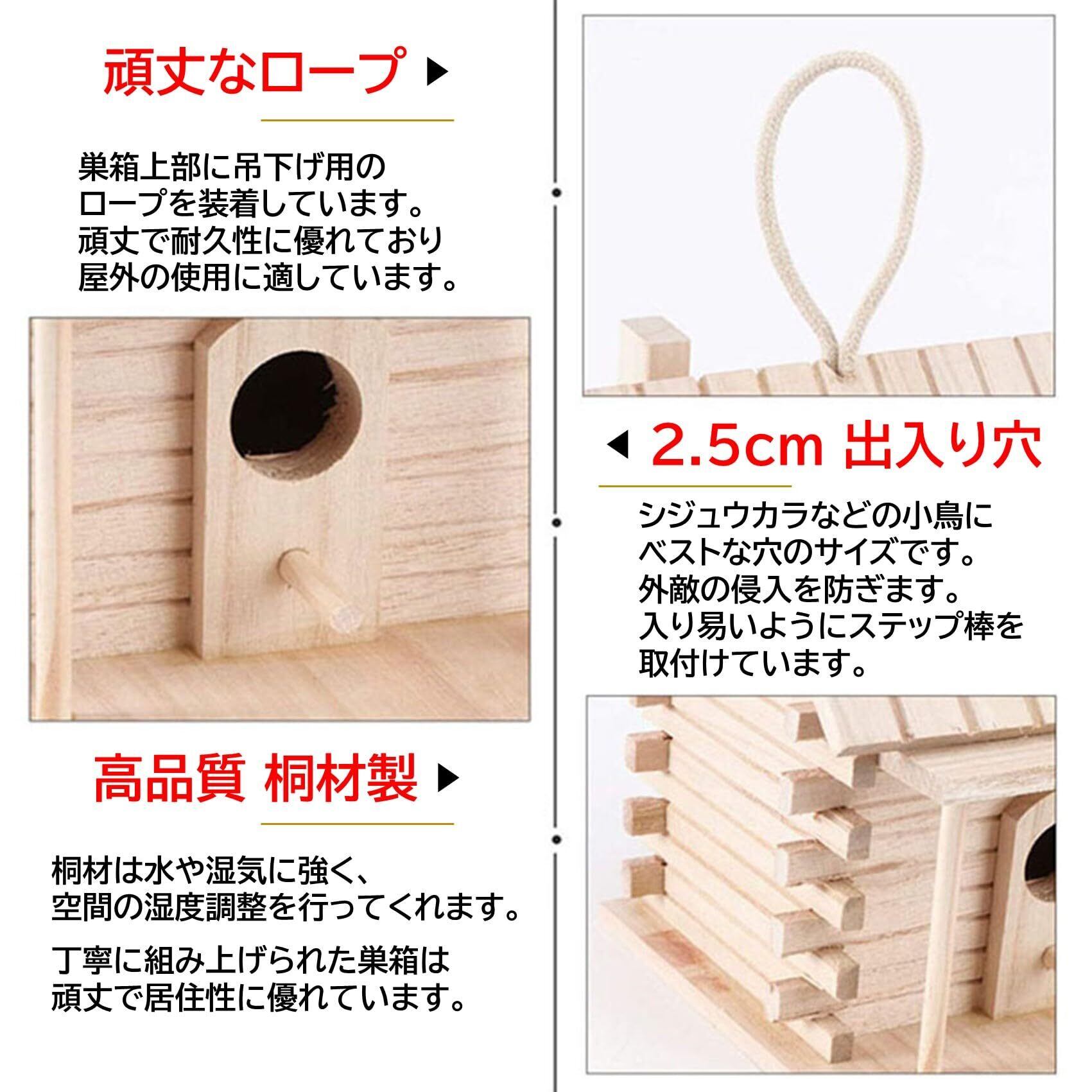 【高品質桐材製】桐材は水や湿気に強くカビにくい素材で、空間の湿度調整も行ってくれます。丁寧に組み上げられた巣箱は頑丈で居住性に優れています。巣箱上部には吊下げ用のロープを装着していますので木の枝などに吊下げて設置することもできます。固定設置、吊下げ設置と設置方法を選ぶことができる巣箱です。