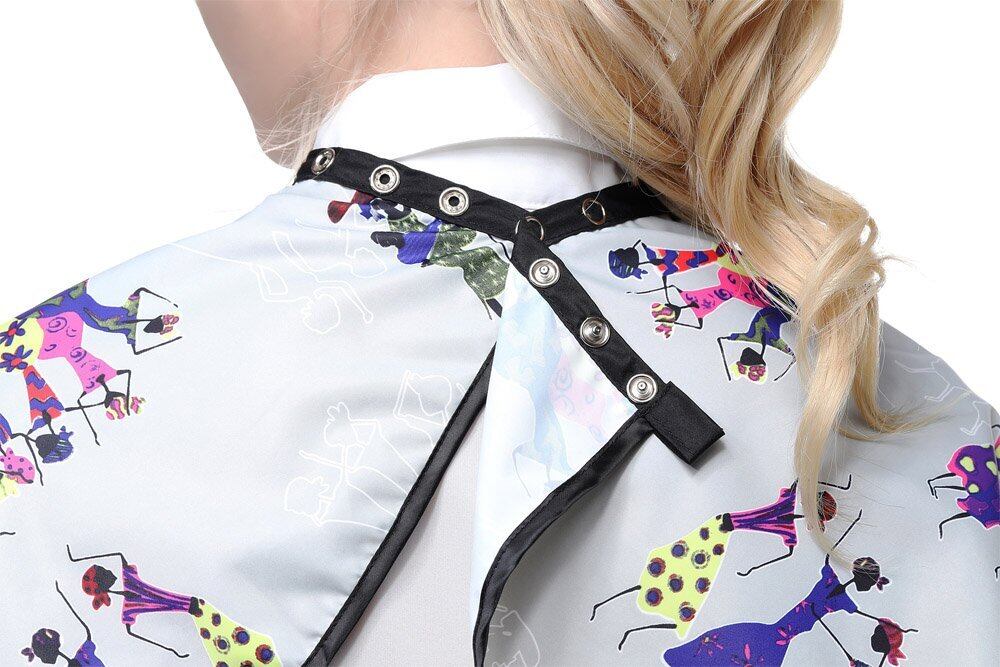 このケープは化粧よごれから避け、頭髪のセット及びカットから発生する頭髪切りくずから衣服を守ります。メイクアップアーティストや個人的な使用に最適です。