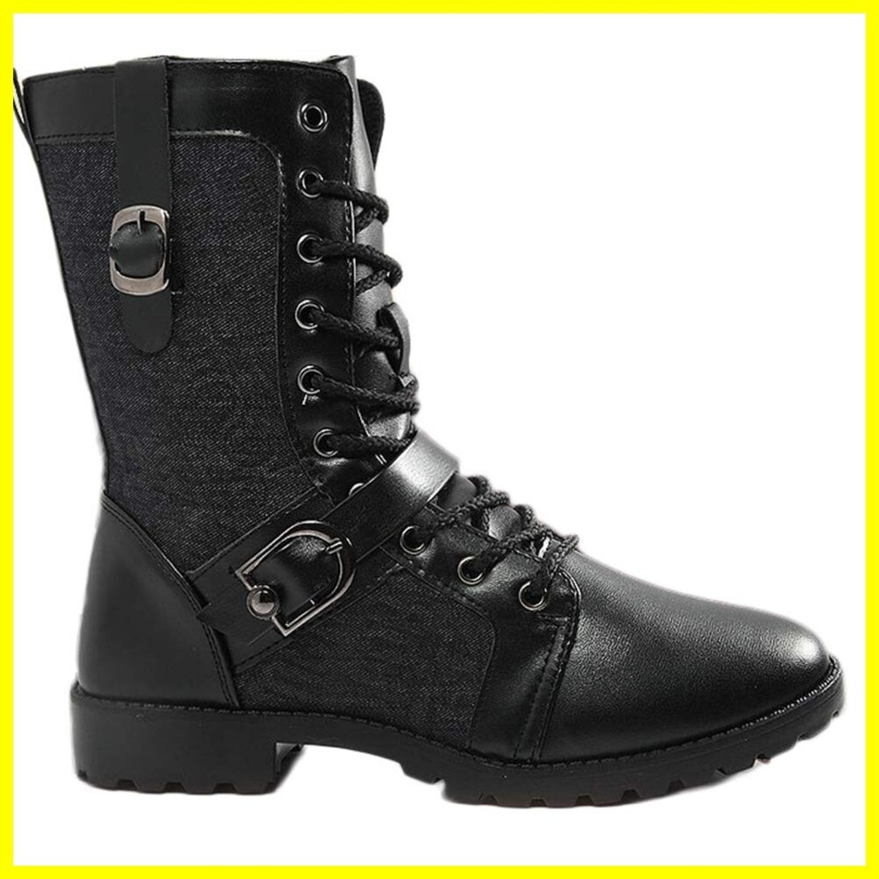 サイドの生地を光沢のあるPUレザーと、デニムっぽいアルファベットが表記されたタイプの違う生地をつかったデザインがデザインがハードイメージがにみごとにマッチ。シンプルなルックスで上品な足元に定番デザインのあみこみ仕様のブーツ、 マニッシュなスタイルからガーリーな雰囲気まで幅広くコーデが可能なアイテムです。