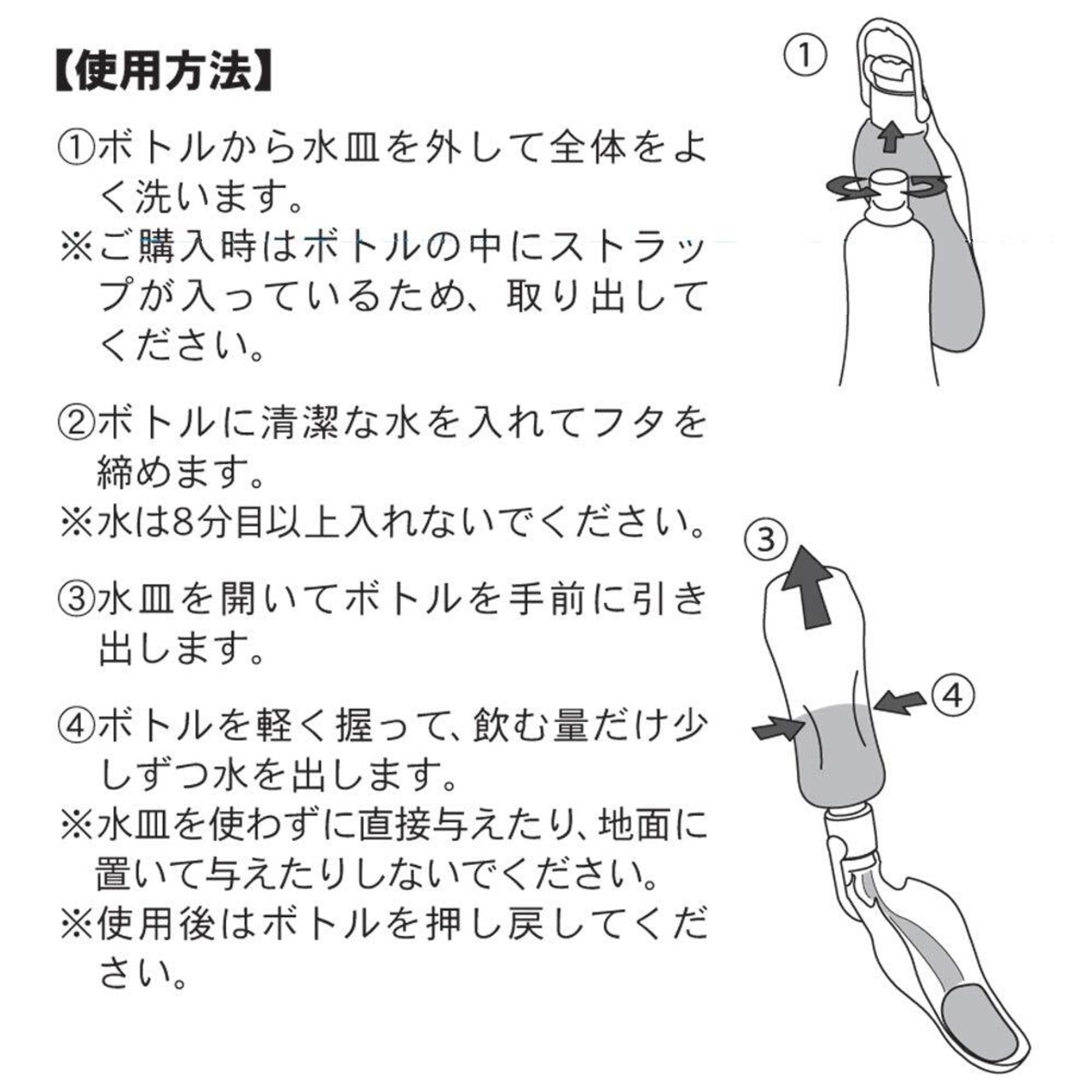 1ボトルから水皿を外して全体をよく洗います。※ご購入時はボトルの中にストラップが入って いるため、取り出してください。2ボトルに清潔な水を入れてフタを締めます。※水は8分目以上入れないでください。3水皿を開いてボトルを手前に引き出します。4ボトルを軽く握って、飲む量だけ少しずつ水を出します。※水皿を使わずに直接与えたり、地面に置いて与えたりしないでください。※使用後はボトルを押し戻してください。