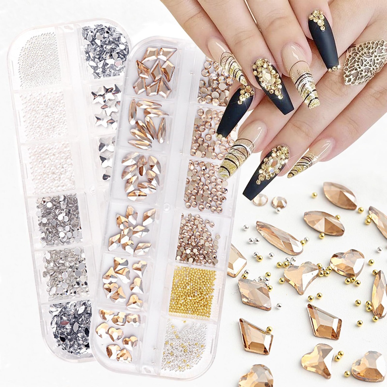 【数量】約8種類のラインストーン。形はダイヤ、スクエア、ラウンド、ハートなど。 また、丸いラインストーンの大きさが4種類、小さなゴールドビーズとホワイトパールが混ざったものが2区画あります。サイズは1mmから8mmまで。すべてのネイルデコレーションニーズに適しています。初心者やDIYデザイナーに適しています!