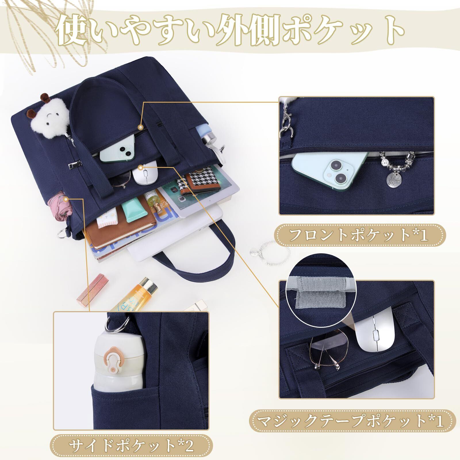 【商品仕様】トートバッグサイズ:約高さ32cm×幅34cm×マチ14cm。持ち手の高さ:25cm。重さ:約650g。<ポケット>メインポケット*1、内側ファスナーポケット*1、内側ポケット*1、フロントファスナーポケット*1、マジックテープポケット*1、サイドポケット*2。<付属品>ショルダーストラップ、取り外し可能な雲飾り。
