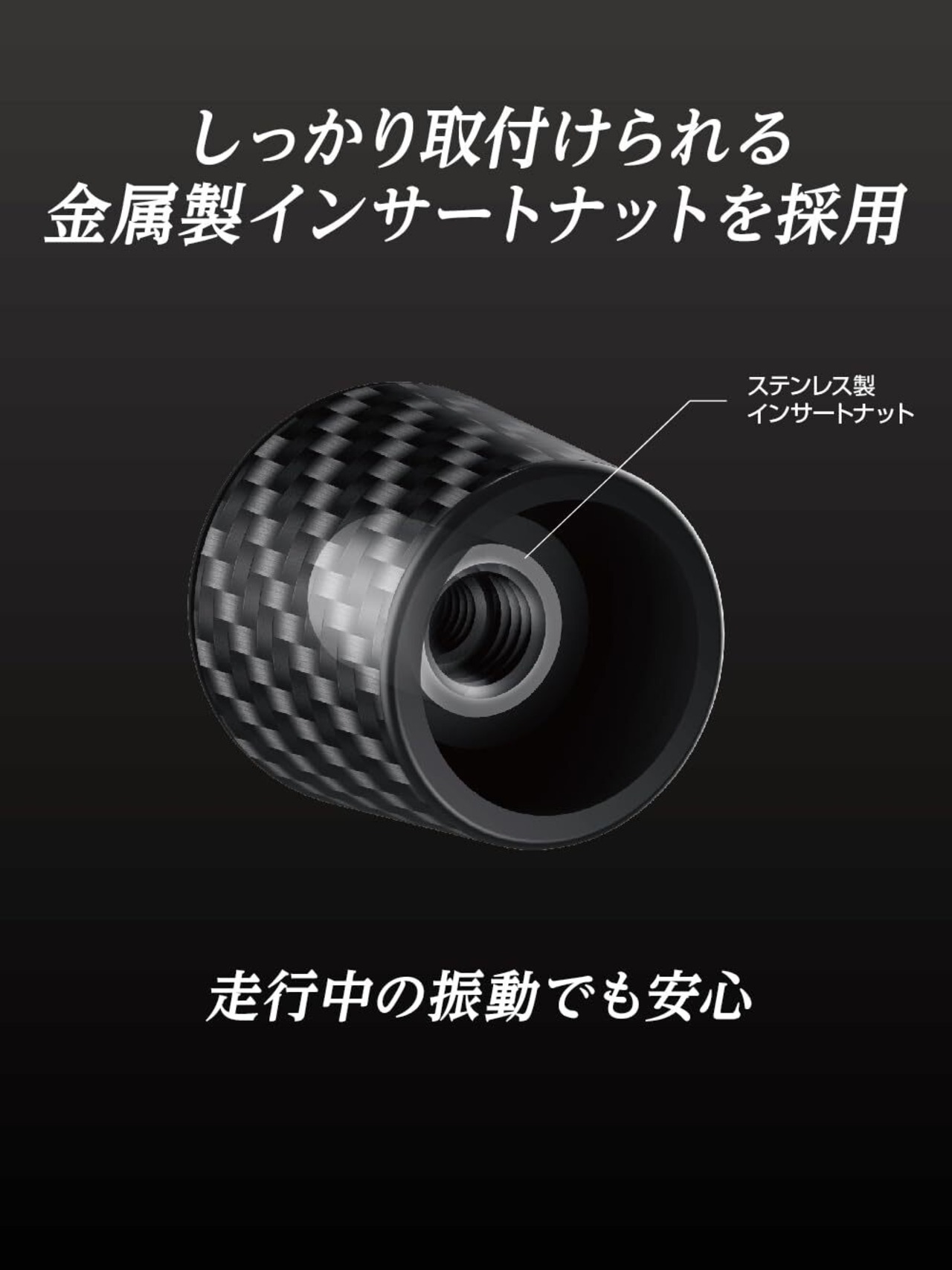 リアワイパーボルトに取付けて、リアビューをドレスアップ。スポーティに飾るカーボンテクスチャデザイン。シャフト部を目立たせず、リアビューのスムージング化に最適。