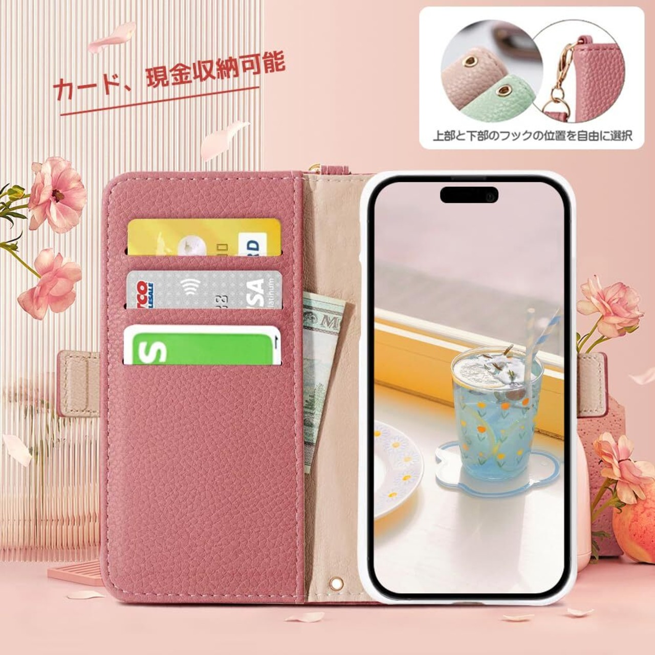 【実用性高いデザイン】①ストラップホールは上下に二つあり、ハンドストラップ付き、お好きな使い方をオプションできる。指先に通して使うのに適した長さで、落下事故の予防になります。ネックスストラップは長時間の仕事で手を解放したい時と旅行する時にオススメ ②カメラ、電源ボタン、音量ボタン、イヤホンジャック、コネクタ、スピーカーホール等に支障なく使用可能となるし、やわらかいTPUケース、着脱しやすい、縫製も一つずつ丁寧に仕上げられて、落ち着いてる色と合わせて、どんな場合でも相応しいし、プレゼントにもオススメできる手帳型です。③滑りにくく、落下時の衝撃を効率よく吸収するようにケースの各コーナー内側が設計されています。