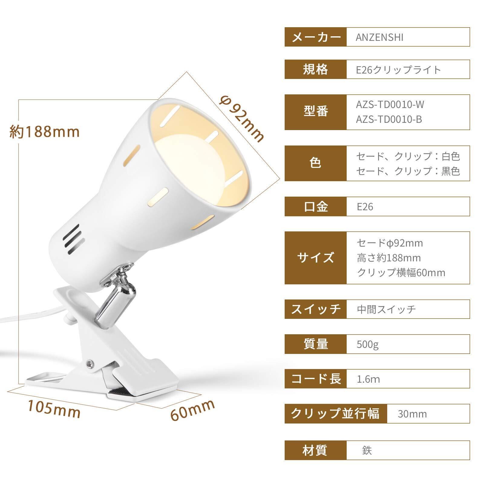 E26クリップライト ANZENSHI スポットライト 電気スタンド クリップ 間接照明 角度調整可能 コード長1.6m金属製 E26電球別売 (白)