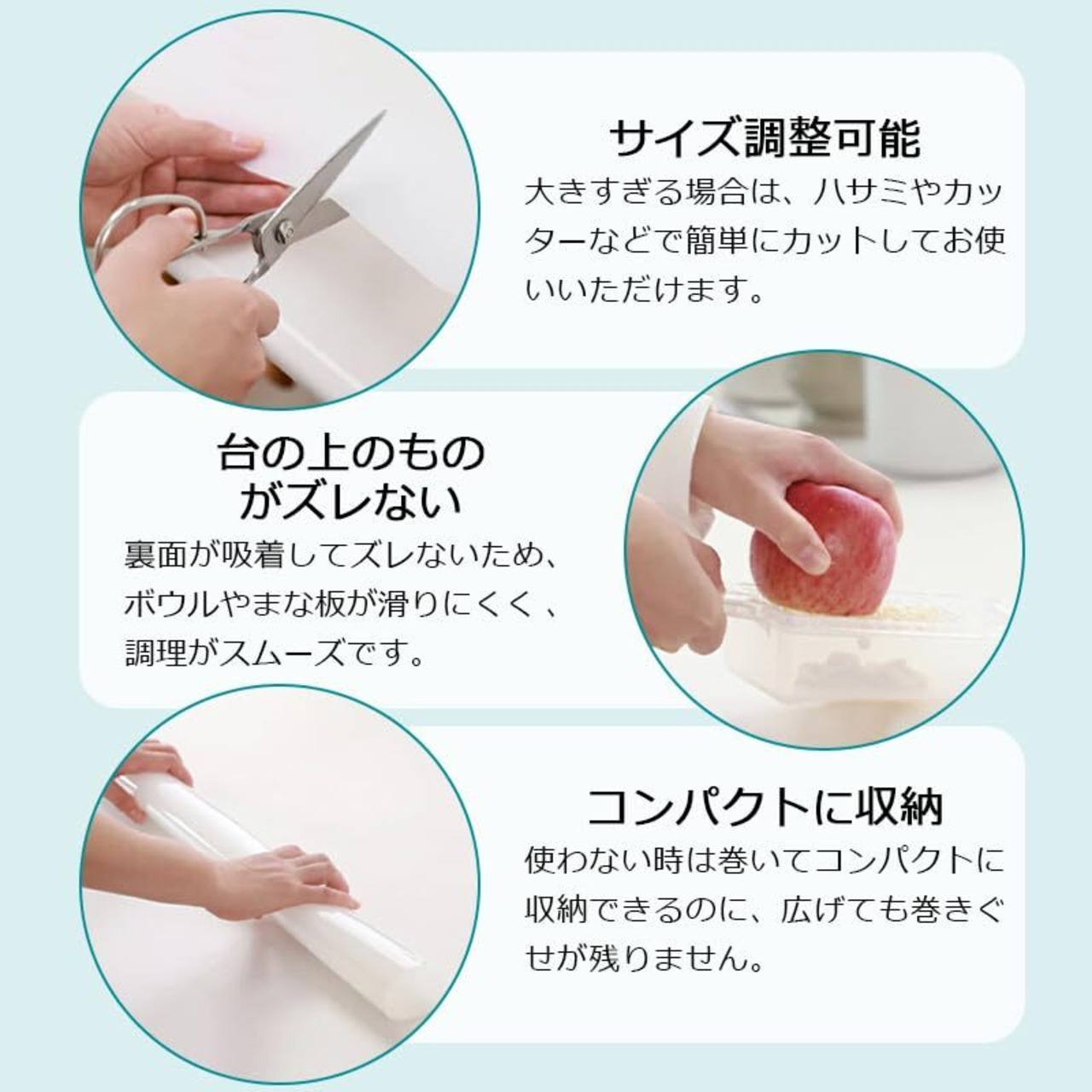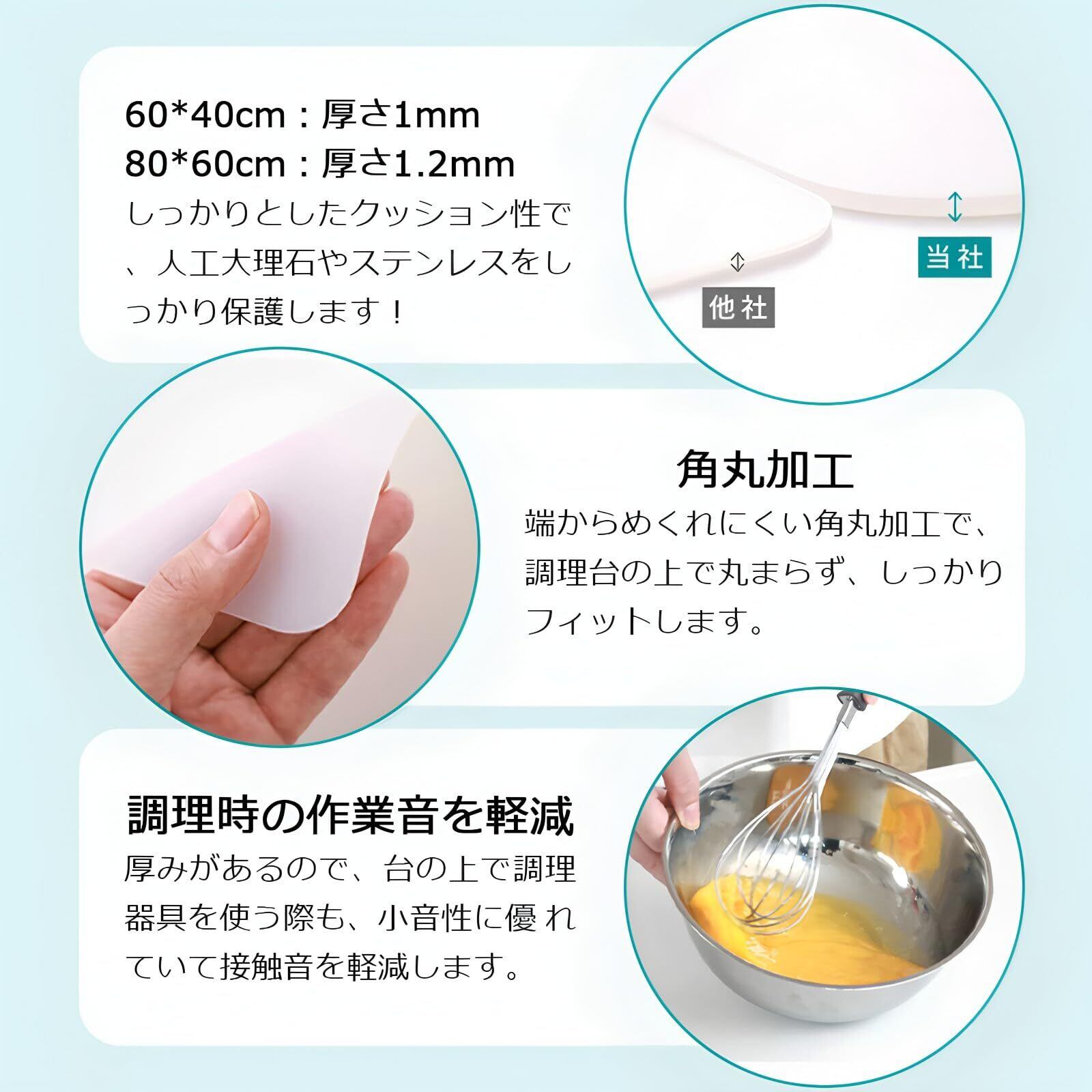 【作業効率アップ!快適なキッチン環境を実現】 広々と使える大判シリコンマット。調理台やカウンターの滑り止めとして活躍し、作業中の安定感がアップ。キッチンだけでなく、DIY作業台やデスク保護マットとしても便利に使えます。