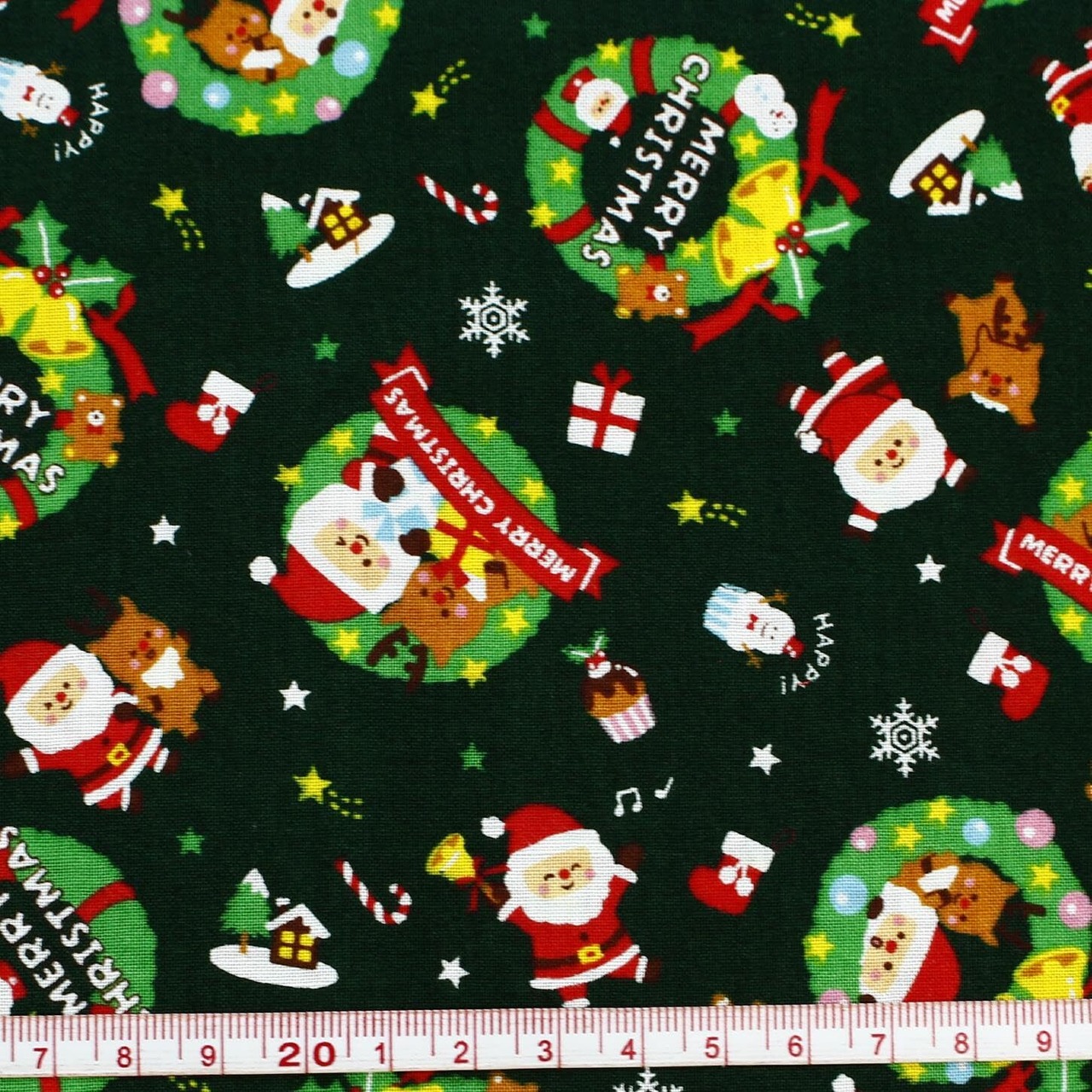 Christmas Collection クリスマスプリント生地 サンタとリース柄 巾110cm×50cm切売 Aグリーン AP45102-1A