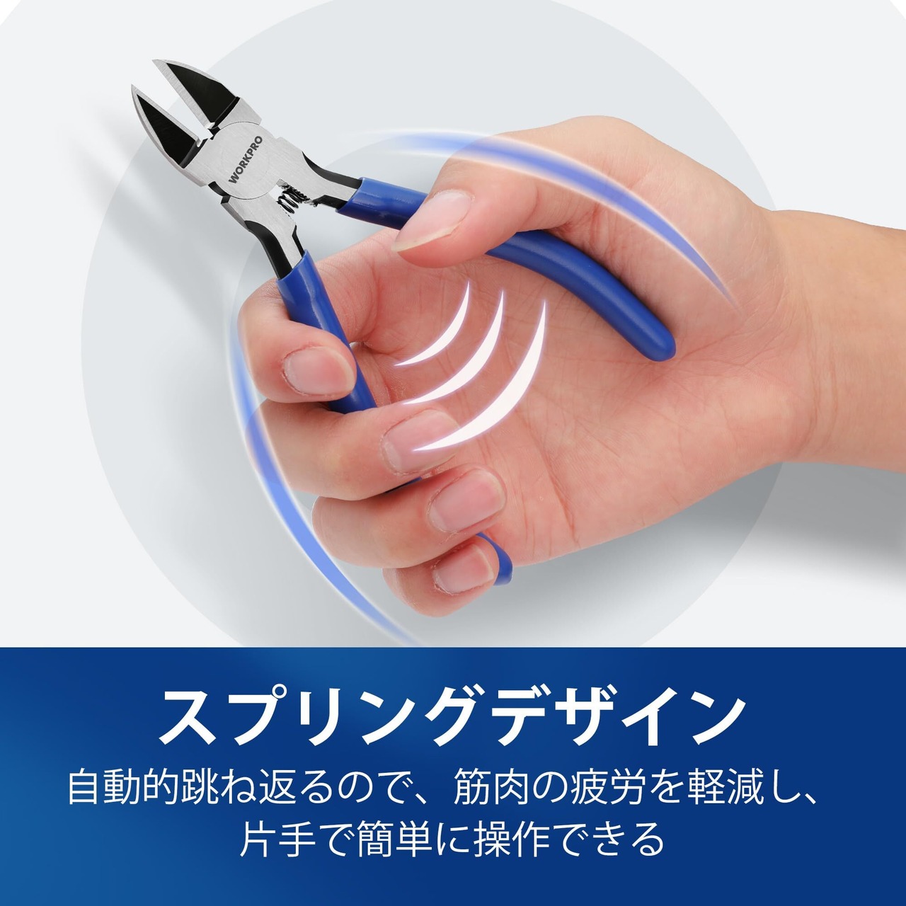 【ばね付け】ニッパーはばね付けのデザインによって、より弱い力で連続切断できます。自動的跳ね返るので、長時間使っても疲れません。片手で操作でもとても楽です。