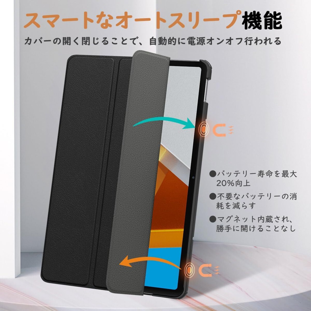 「省エネなオートスリープ機能」 内蔵されるマグネットより、ケースの開閉より自動的にウェイク・スリーブになるスマートなオートスリープ機能がついており、バッテリーの消耗を減少し、待機時間の延長には一役を立ってくれます。