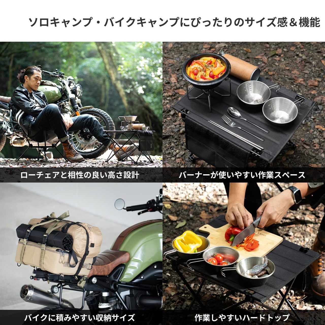 バイクツーリングに特化。持ち運びしやすくローチェアと相性の良いソロテーブルです。