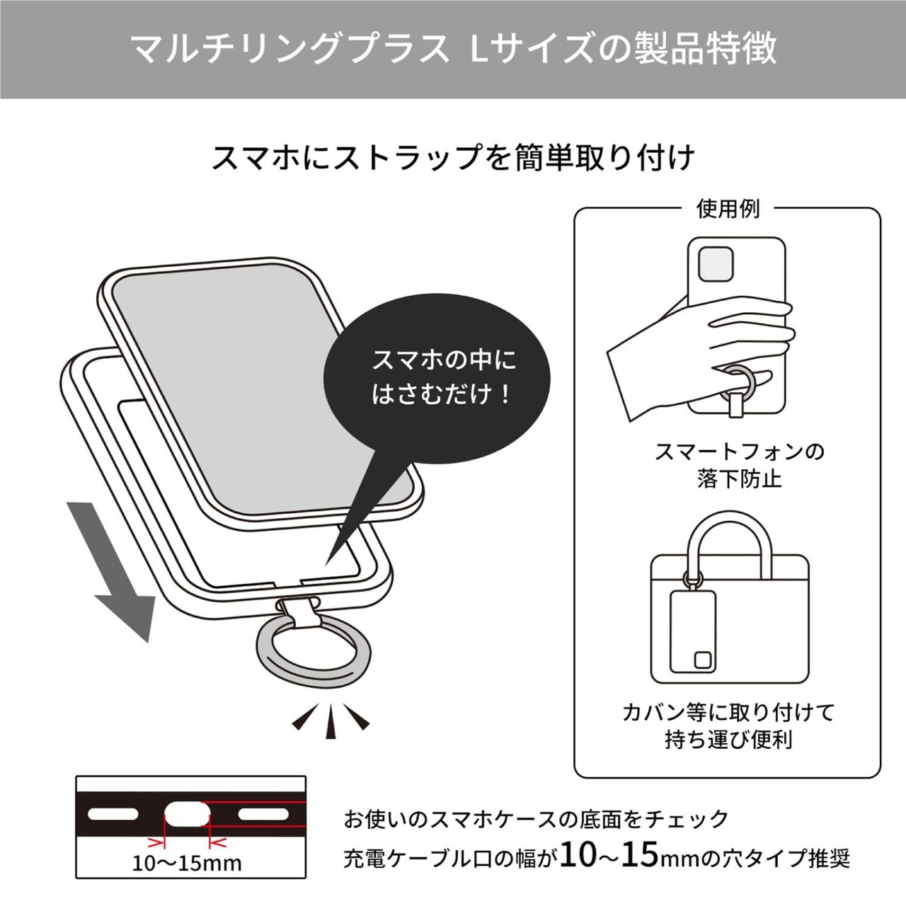※本製品は、充電ケーブル口の幅が10~15mmのスマホケースと組み合わせてのご使用を推奨しております。推奨寸法以外のケースでのご使用は、充電口から本品が抜けやすくなる場合がございますのでご注意ください。