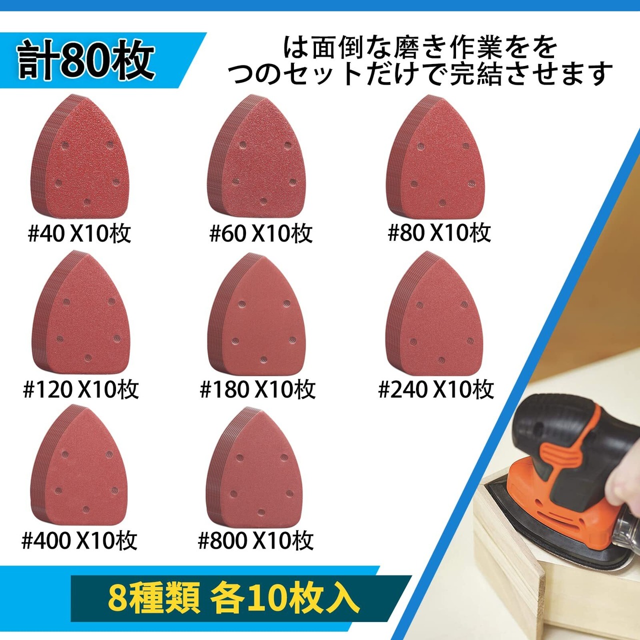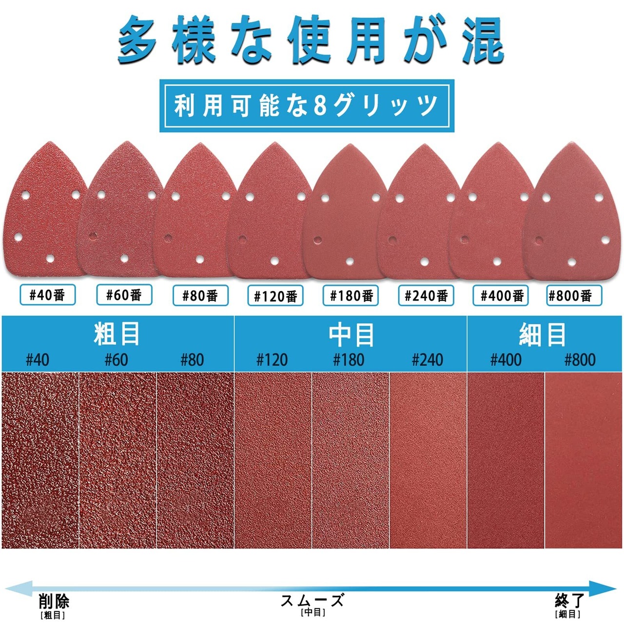 【コスパ抜群、種類多い】80枚サンディングパットセット 粗荒くから細かくまで 各10枚 #40/#60#80/#120/#180/#240/#400/#800 番手の番号は裏面に表記があります 色々な番手が入っているので、ほとんどのニーズをカバーする砥粒 何でも出来ます