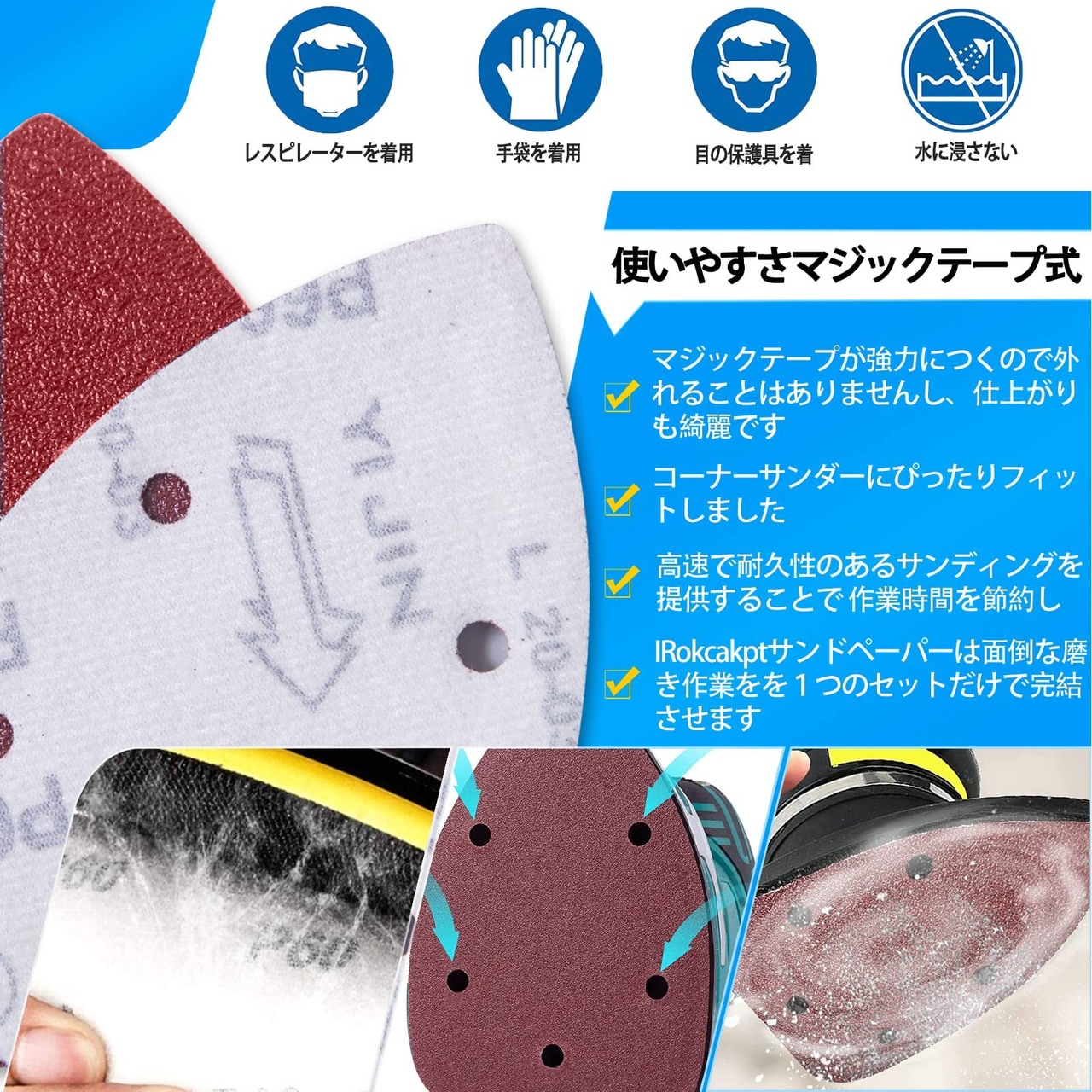 【使いやすさマジックテープ式】簡単に着脱できる、マジックテープが強力につくので外れることはありませんし、ミニサンダーに簡単に装着できます、集塵用に5つの穴を事前に打ち抜きます 目詰まりの心配はありません
