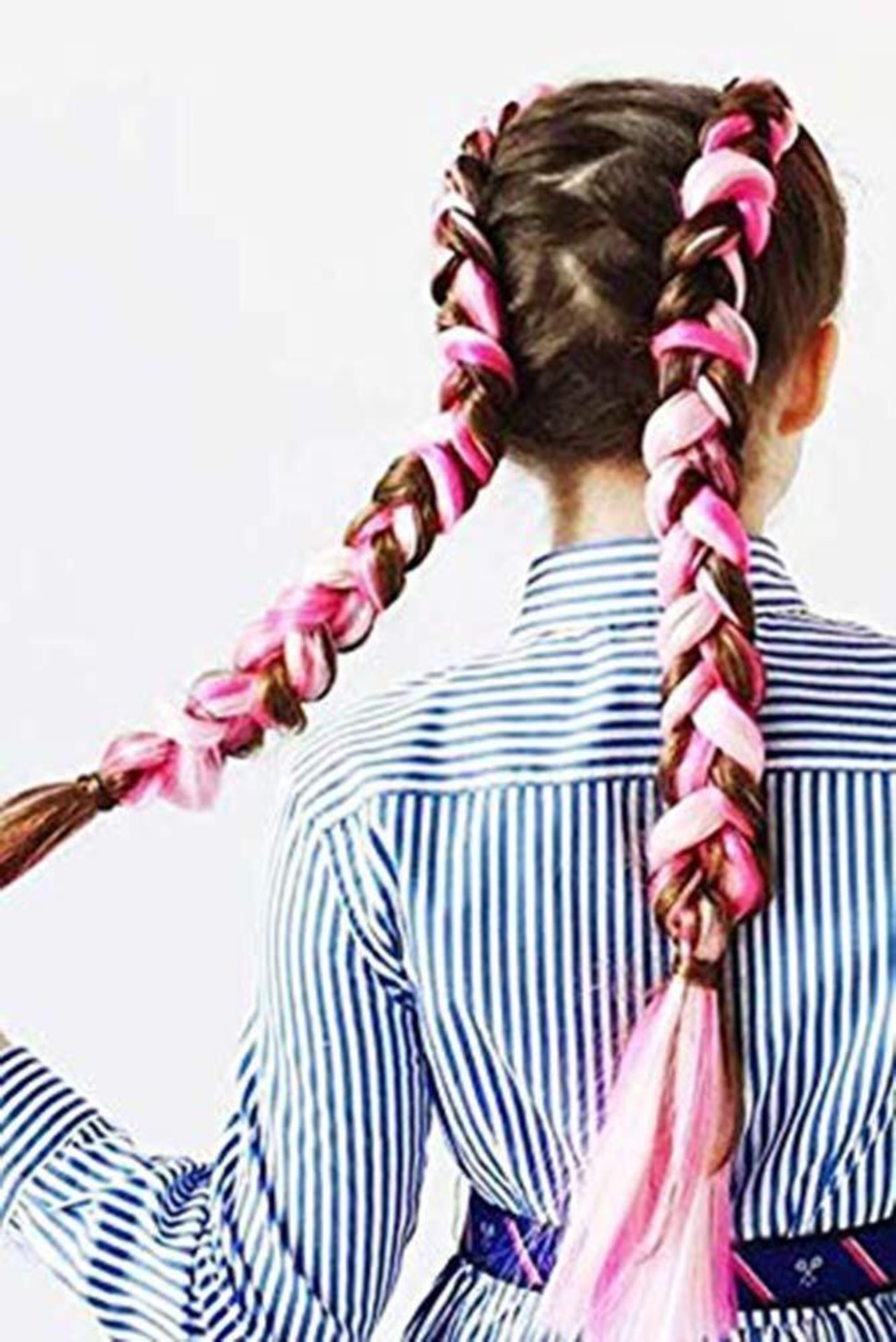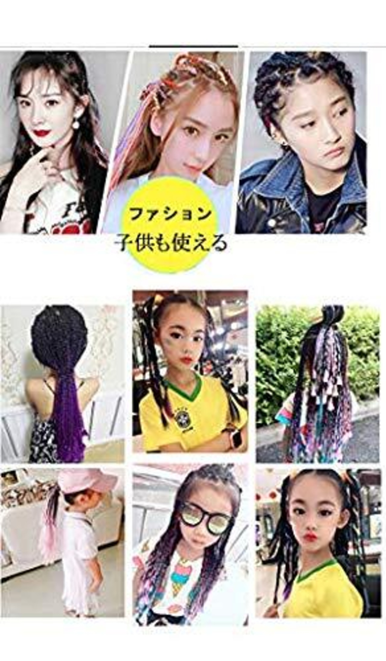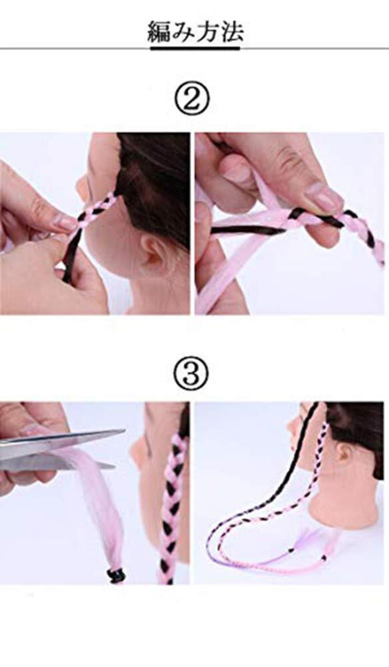 【使用方法】このジャンボブレイズを分けて、小さい束にして、何本に分けた後、ご自分の髪にセットします;そして、輪ゴムでおさげに固定してから、そのヘアリングを輪ゴムに覆います、すると、完成です