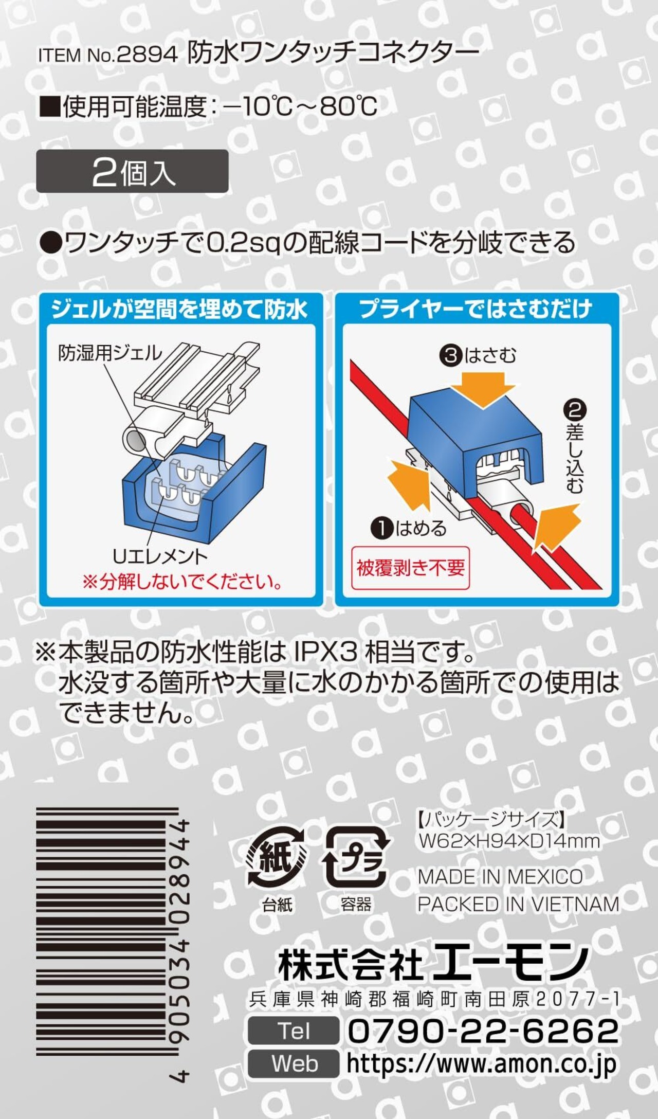 【バイクOK】エーモン(amon) 防水ワンタッチコネクター(割り込み分岐用) DC12V30W以下/DC24V60W以下 2個入 2894