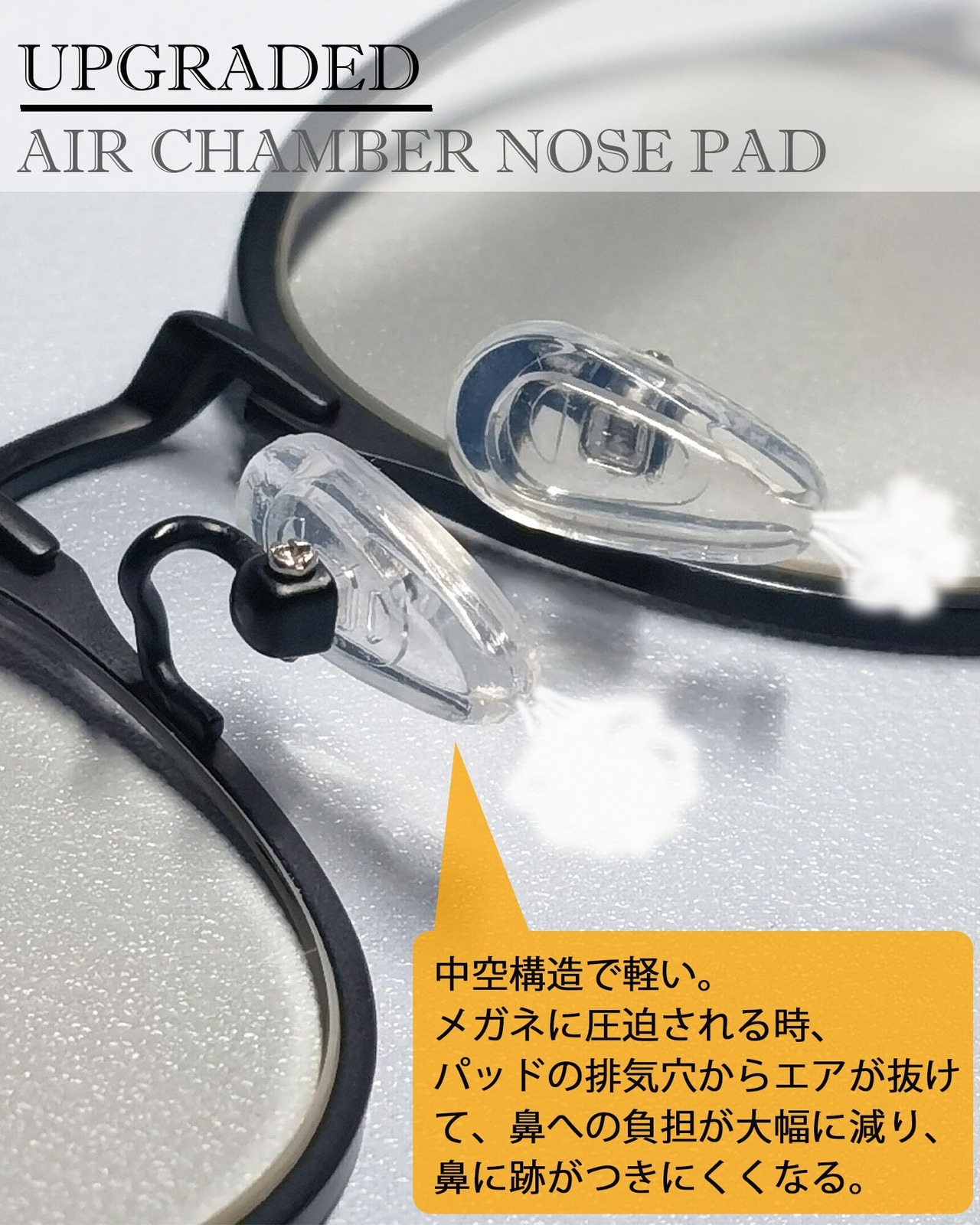 【エアクッションメガネ鼻パッド】中空構造で軽い。ぷにぷにとしていて柔らかい。メガネに圧迫される時、パッドの排気穴からエアが抜けて、鼻への負担が大幅に減り、長時間かけても痛くないし鼻に跡がつきにくくなります。厚さ約3.5mm、まつ毛がレンズに当たりにくくなります。