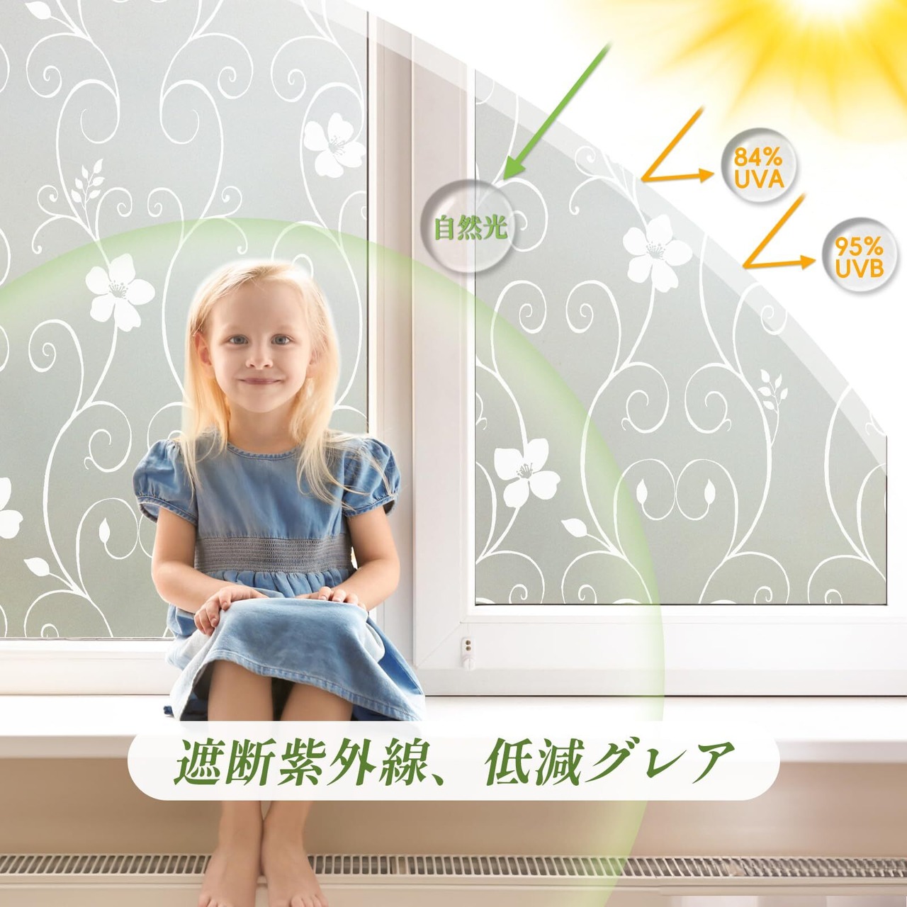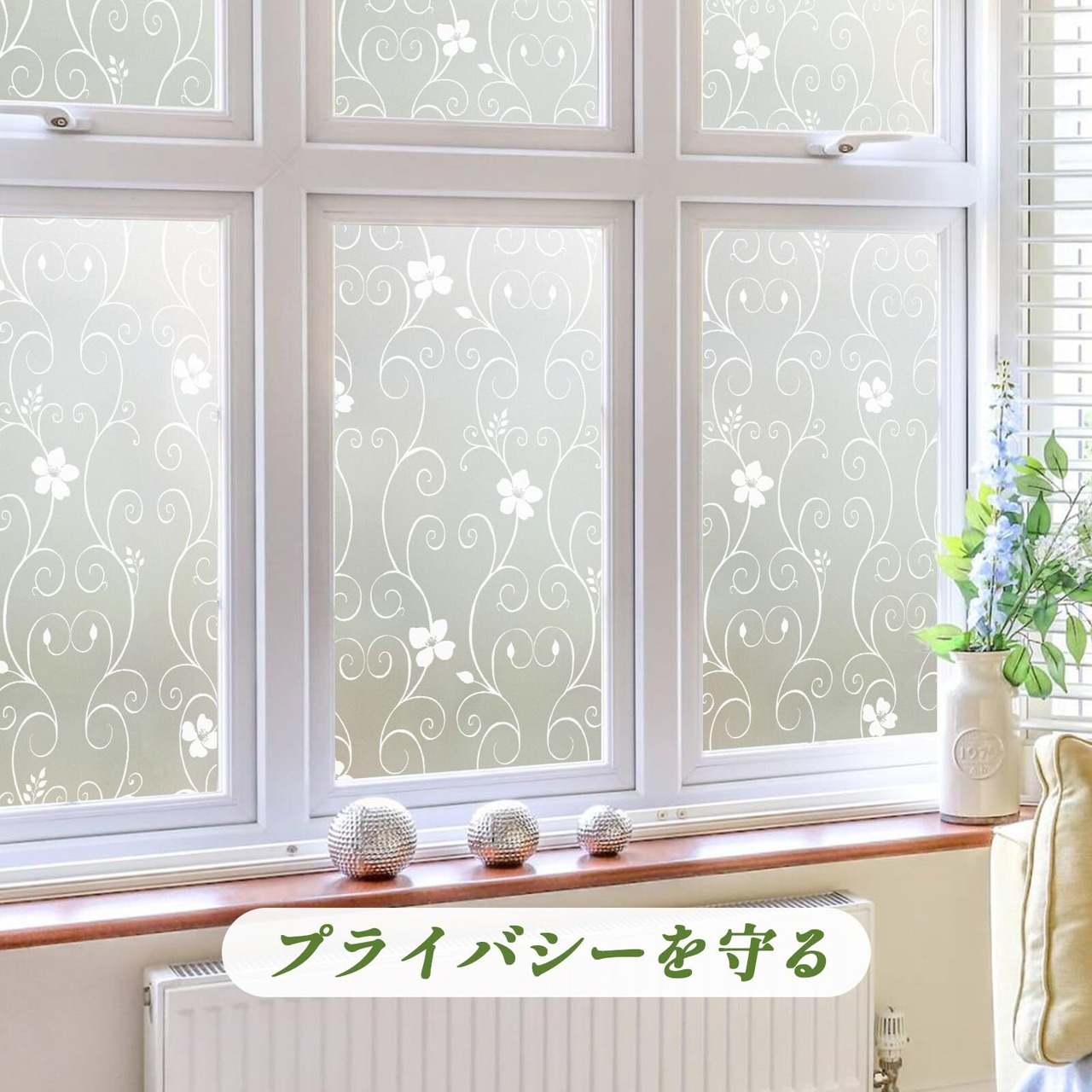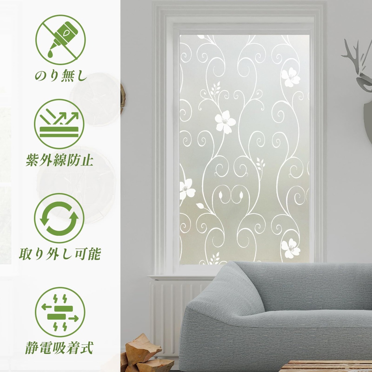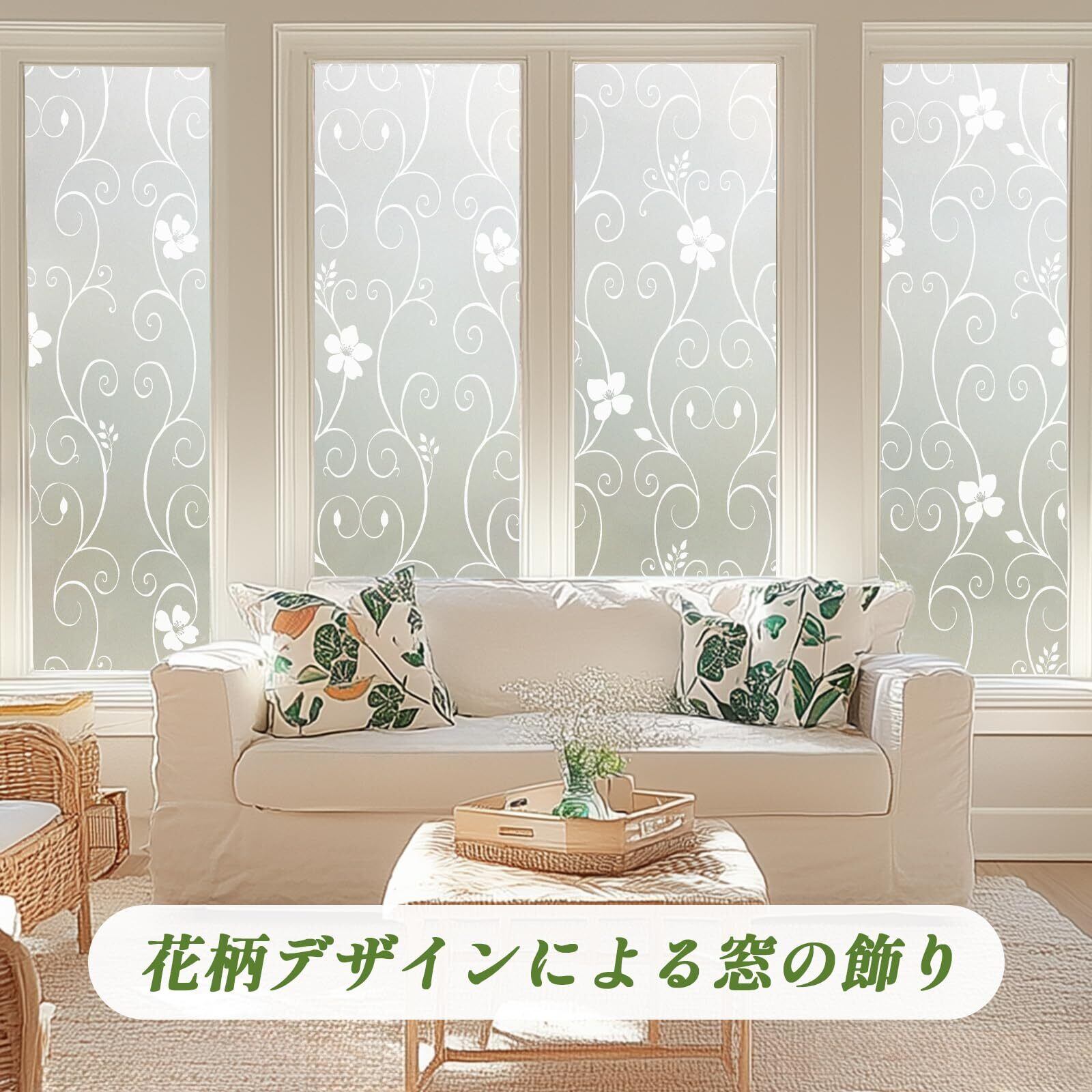 Qualsen 窓ガラス目隠しフィルム ステンドグラス シール 窓用フィルム すりガラス調 目隠しシート めかくしシート すりガラス調 白花柄 静電気吸着タイプ UVカット 貼り直し可能 寝室 玄関 窓 断熱 遮光 飛散防止 台風対策 (0.3M X 1.2M)