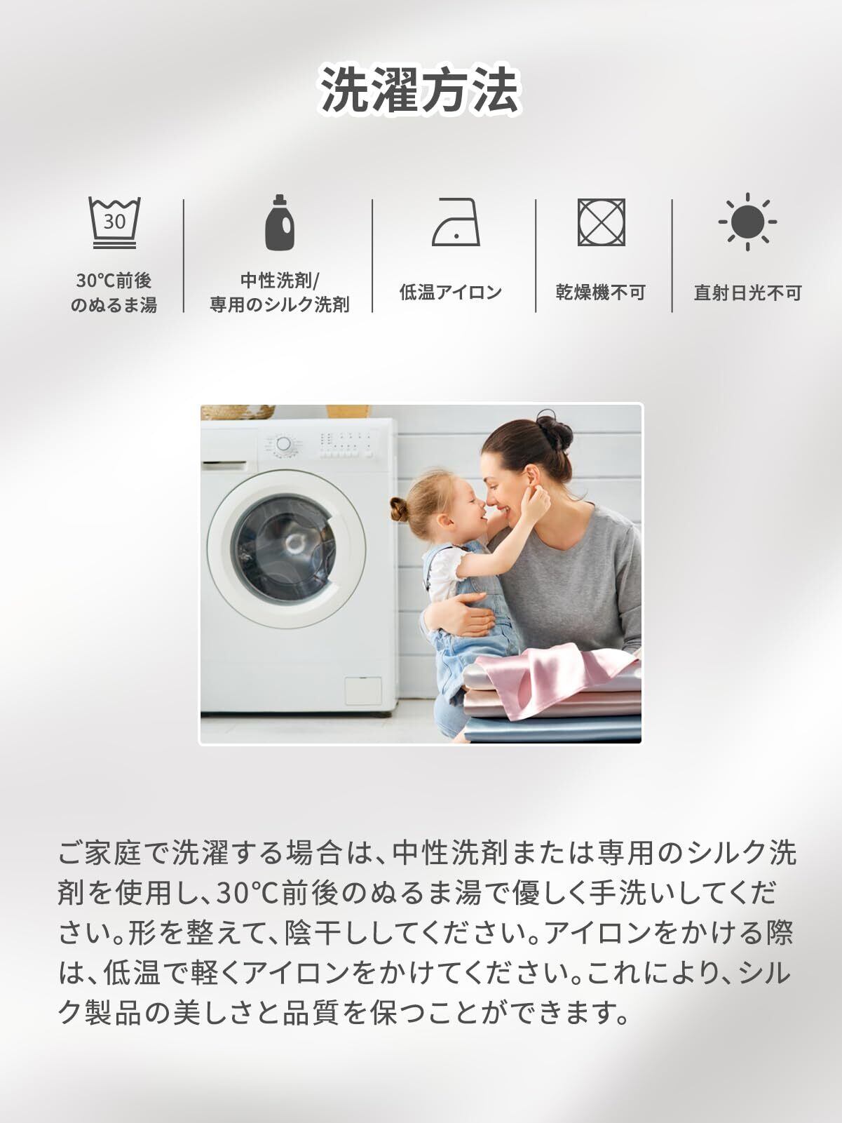 洗濯方法: ご家庭で洗濯する場合は、中性洗剤または専用のシルク洗剤を使用し、30℃前後のぬるま湯で優しく手洗いしてください。形を整えて、陰干ししてください。アイロンをかける際は、低温で軽くアイロンをかけてください。これにより、シルク製品の美しさと品質を保つことができます。