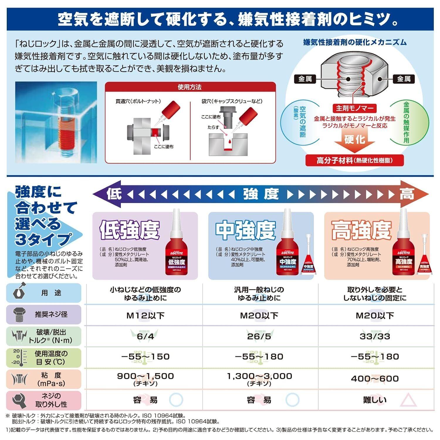 「ネジロック」は、金属と金属の間に浸透して、空気が遮断されると硬化する嫌気性接着剤です。金属接合部で空気の供給を断つことによって硬化し、衝撃、振動によるねじのゆるみを防止します。空気に触れている間は硬化しないため、塗布量が多すぎてはみ出しても拭き取ることができ、美観を損ねません。また、チキソ性を有するため、使用部位へ塗布後、液たれを低減します。