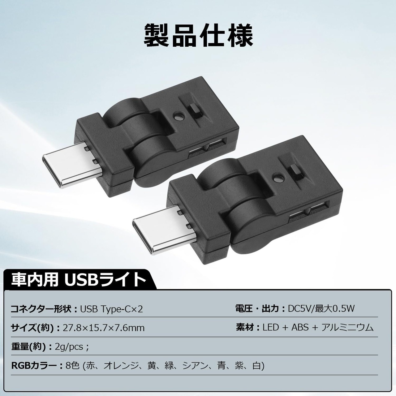 1.【スイング Type-C usbライト】車内にあるc型 USB ポートに接続するだけで、暗くなると自動に点灯するアンビエントライトです。タイプCポートを持つすべての車両や設備に適用できる広範な用途を備えています。「セット内容」:USB LEDライト Type-C×2PCS。