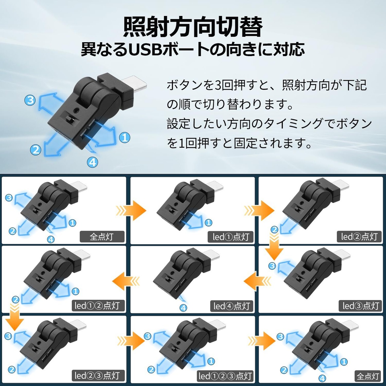 4.【照射方向切替可能&180°首振り】当usbライトにはledが4か所設置され、ボタンを3回押すと、全点灯⇒led①点灯⇒led②点灯⇒led③点灯⇒led④点灯⇒led①②点灯⇒led②③点灯⇒led①②③点灯⇒全点灯の順で自動的に切り替わります。設定したい照射方向のタイミングでボタンを1回押すと、照射方向が固定されます。さらに、usbライト本体が180°回転可能で、必要に応じてスイングして狙った場所を照らせます。