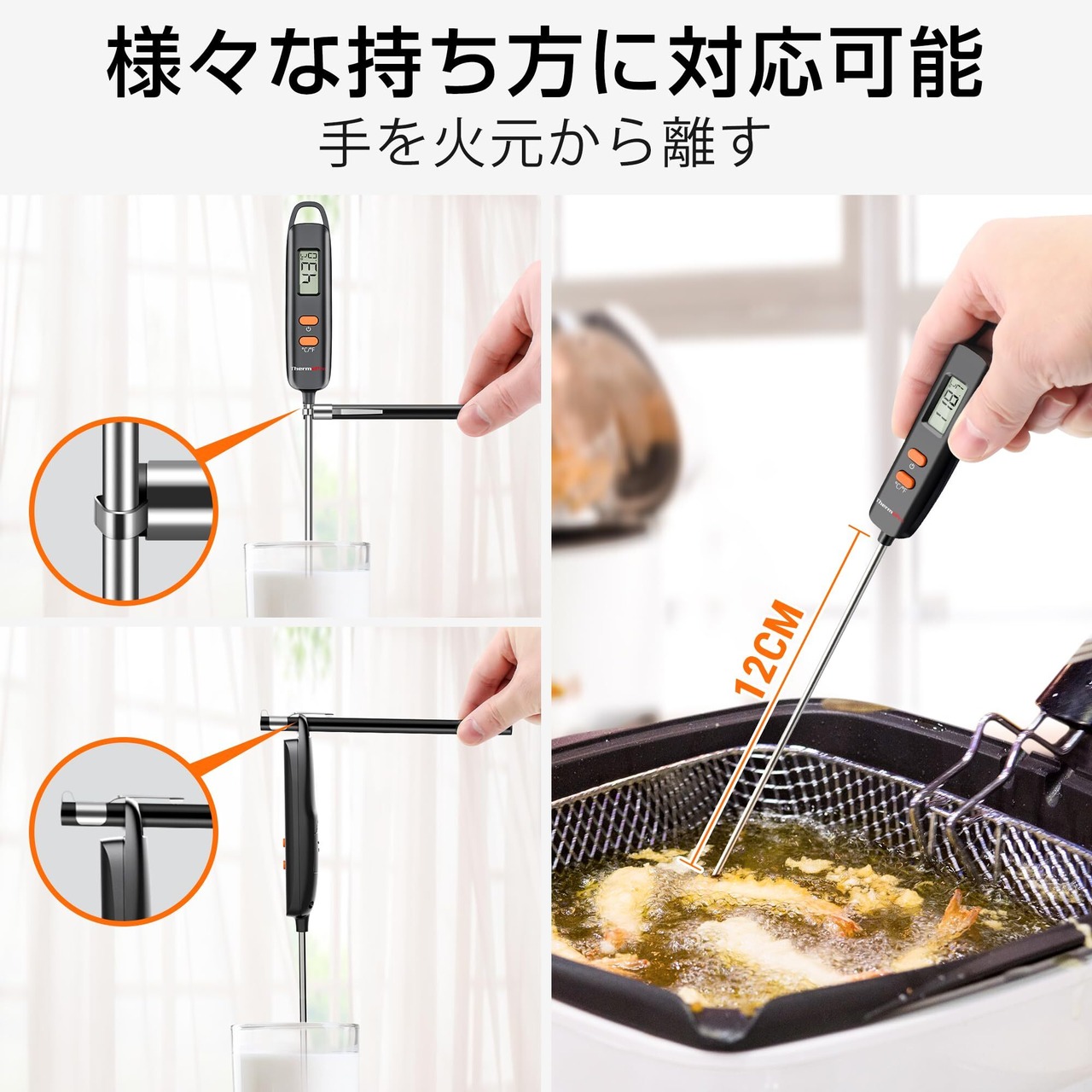 【こんな料理におすすめ】キッチン用温度計は天ぷら・揚げ物などの油の温度管理やパン作り、甘酒作り、焼肉、ハンバーグ、コーヒー作り、赤ちゃんのミルク、お茶、チョコレートの湯煎、野菜の50 ℃洗いなど幅広い温度測定が可能です。先が尖っているため、お肉に刺して中心温度をより正確に測定でき、お肉の焼き加減や食中毒予防としてもおすすめです。