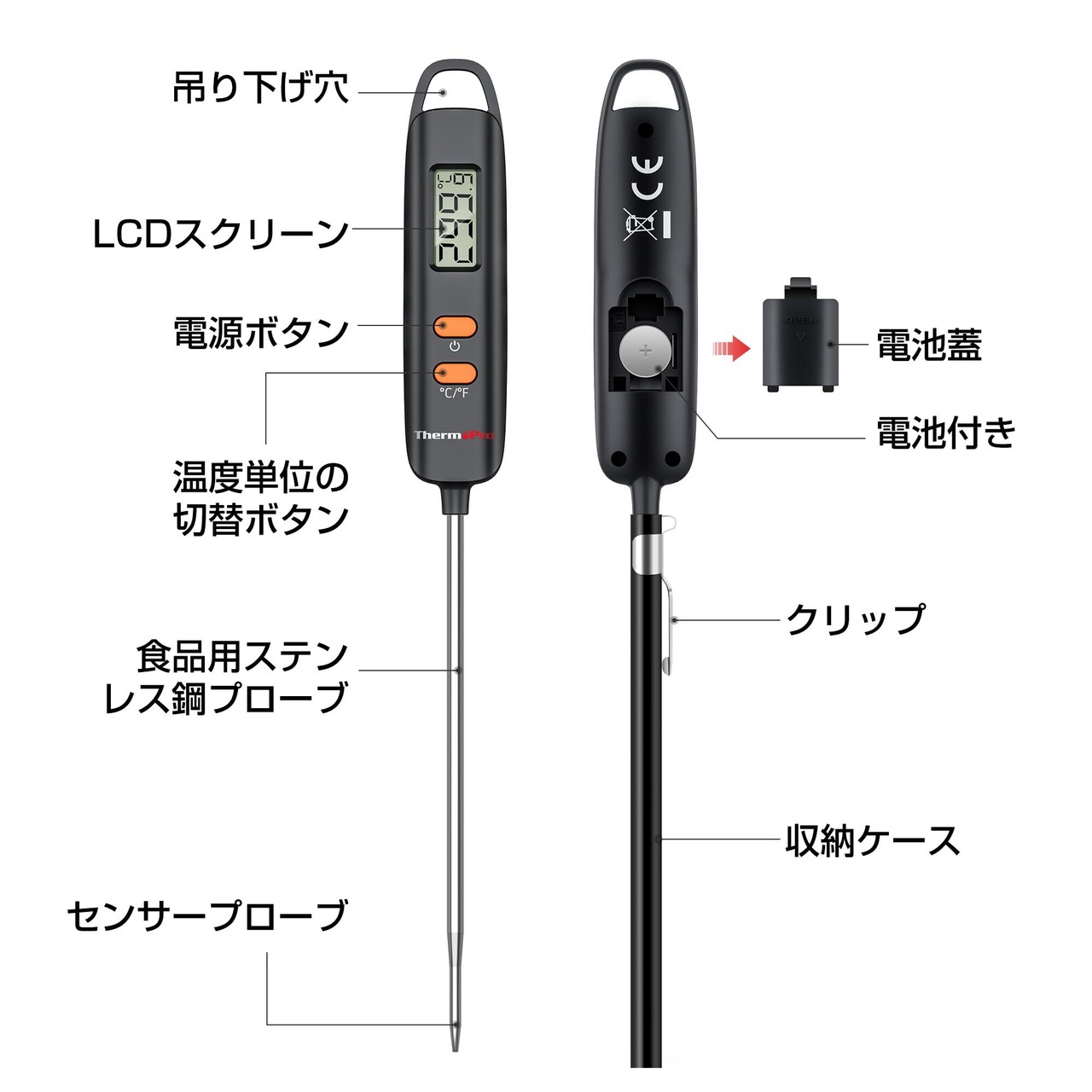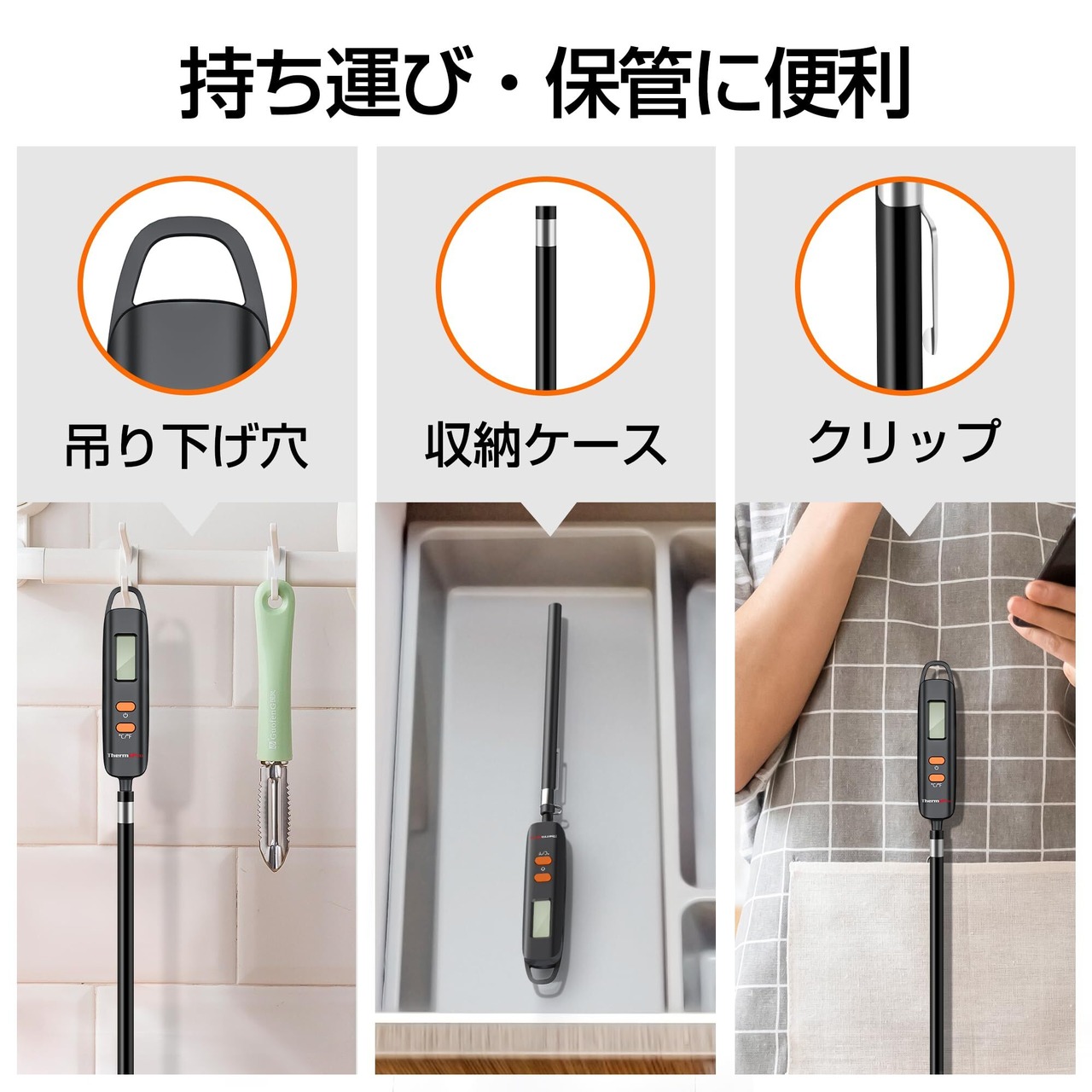 【保管・持ち運びに便利】専用キャップおよび吊り下げ穴が付いており、キャップに収納したり、キッチンのフックにかけたりできます。また、キャップはクリップ付きで、キッチン温度計をポケットなどにクリップすることもできます。保管しやすいだけではなく、持ち運びも便利です。
