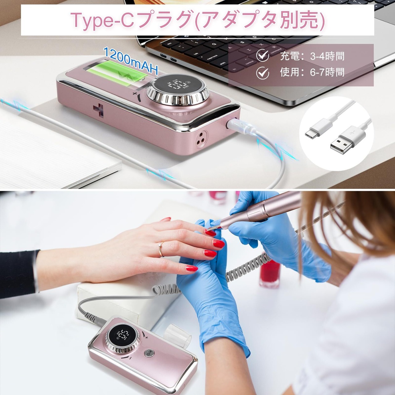 USB充電式:充電コード付き、3~4時間充電したら、6~7時間使用できます。プロサロンやネイリスト一日のお仕事に対応できます。