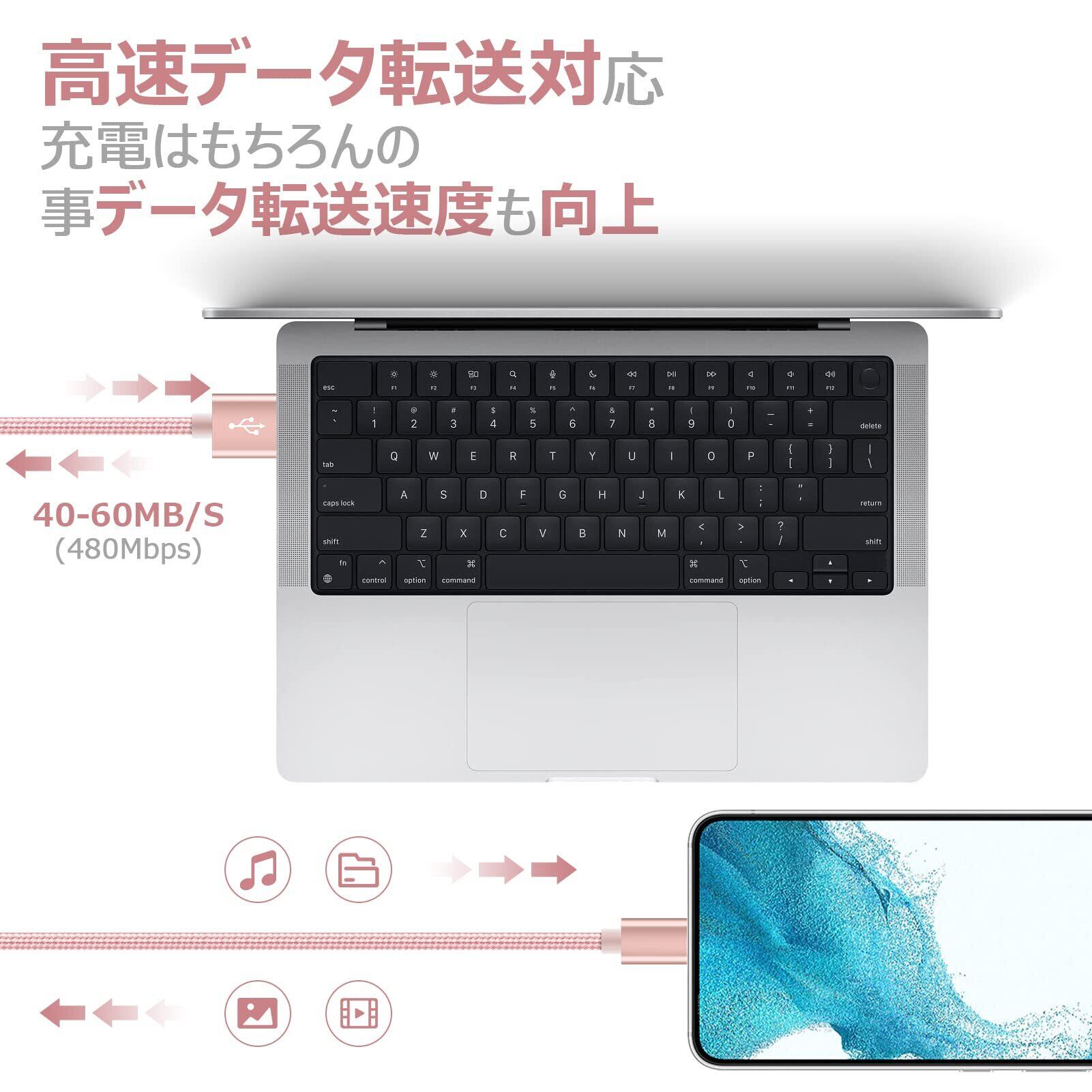 【急速充電・データ転送】このusb c ケーブルは、最大2.4A電流まで対応し、電気抵抗を減少し、充電時間が大幅に短縮されます。市販のケーブルより、充電スピード40%も速くなります。充電の同時に480Mbpsのハイスピードで、パソコンからスマホやタブレットへデータを転送します。