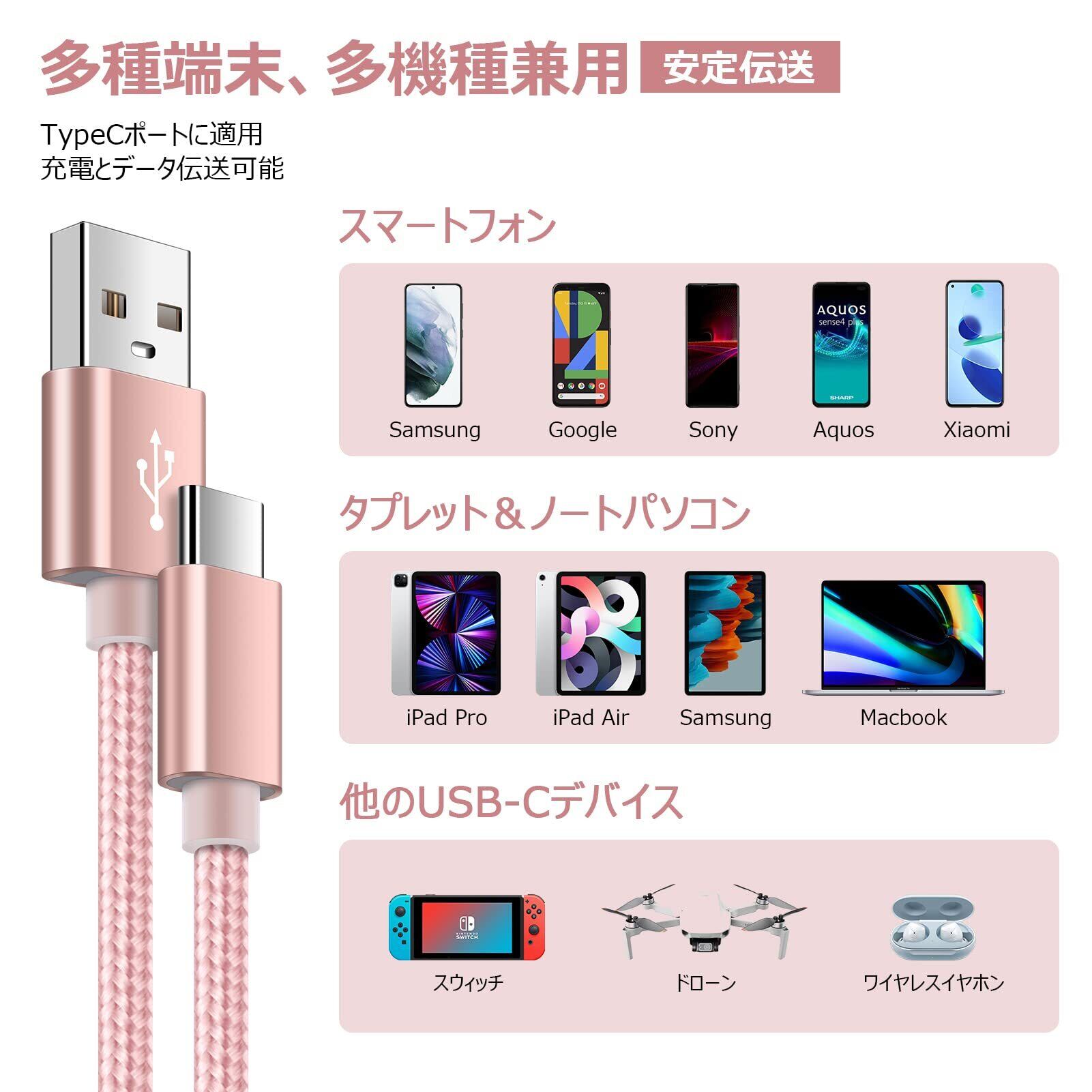 USB Type-C ケーブル QC3.0対応 【2本セット&0.91m】 usb c ケーブル スマホ充電ケーブル タイプC ケーブル iPoto 急速充電 Android充電ケーブル usbケーブル 充電ケーブル USBコード データ転送 断線防止 高耐久ナイロン iPad Air4,iPad Android などのタイプC多機種対応 ローズゴールド+シルバー