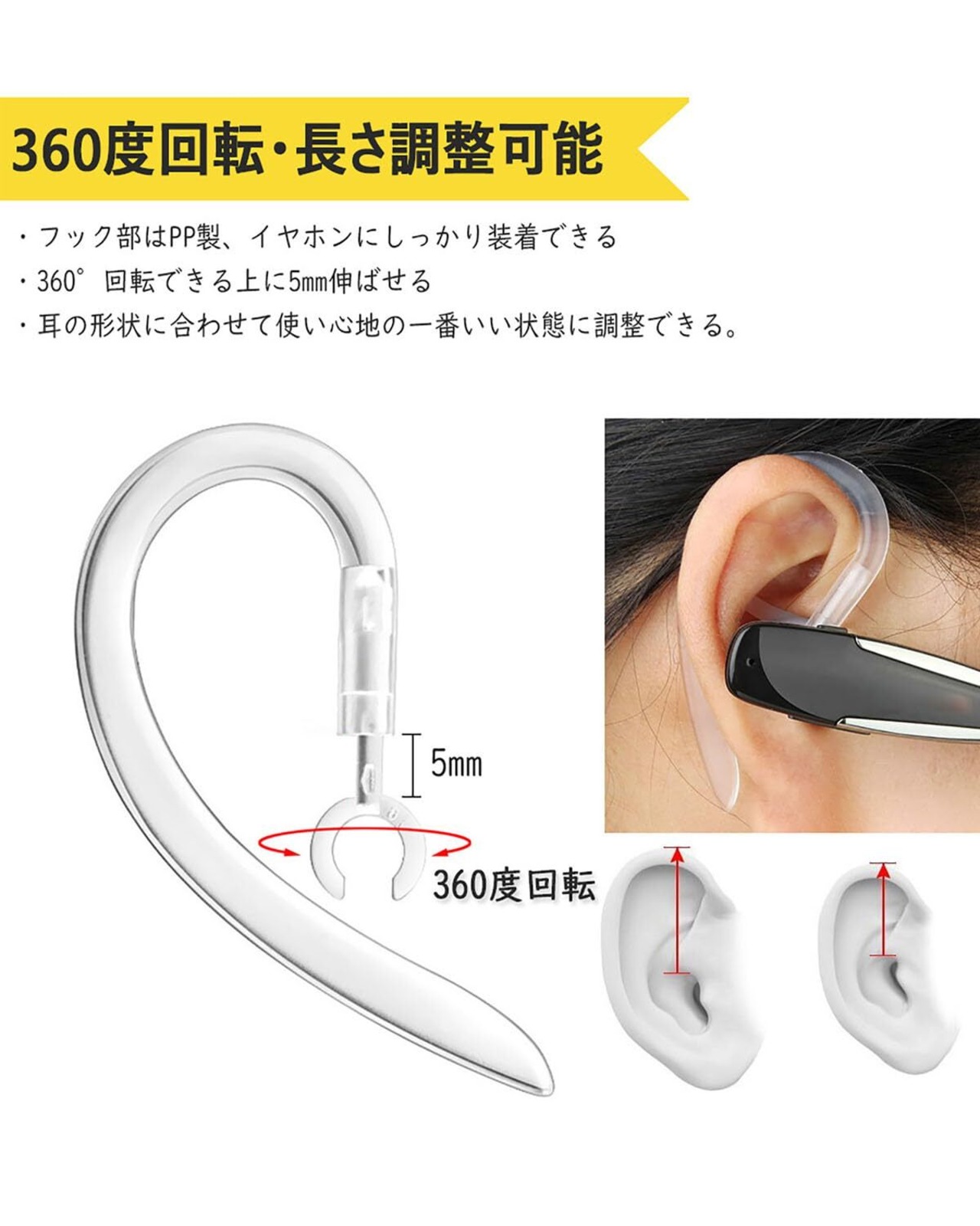 【イヤーフック】サイズ6mm(6.5~7mmのヘッドフォン台座に適応、合わないときはドライヤーで温めて調整することができます)。PLANTRONICS (Poly)M70、M90、 Explorer 500等のBluetoothイヤホンに対応。長さ5mm伸縮可能。一番使い心地のよい状態に調整できます。
