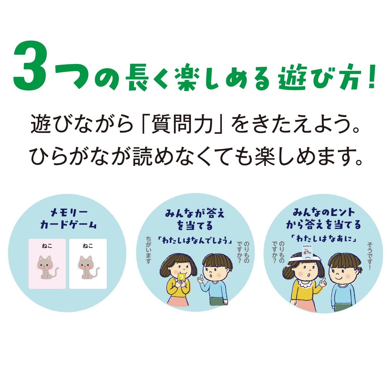 質問力や推理力を鍛える、長く楽しめる3つの遊び方ができるカードゲーム 3パターンの遊び方ができるカードゲームです。レベル1:メモリーカード遊び 2:わたしのもっているカードをみんなであてる、「わたしはなんでしょう?」ゲーム遊び 3:わたしのもっているカードをわたしがあてる、「わたしはなあに?」ゲーム遊び いずれの遊びも文字が読めなくても遊ぶことができ、遊び方2と3では、質問する力や、発想力を遊びながら身につけることができます。