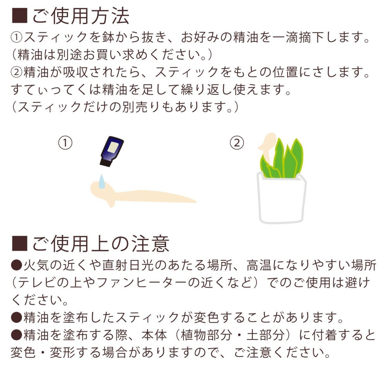 ●精油を塗布したスティックが変色する際、本体(植物部分・土部分)に付着すると変色・変形する場合がありますので、ご注意ください。