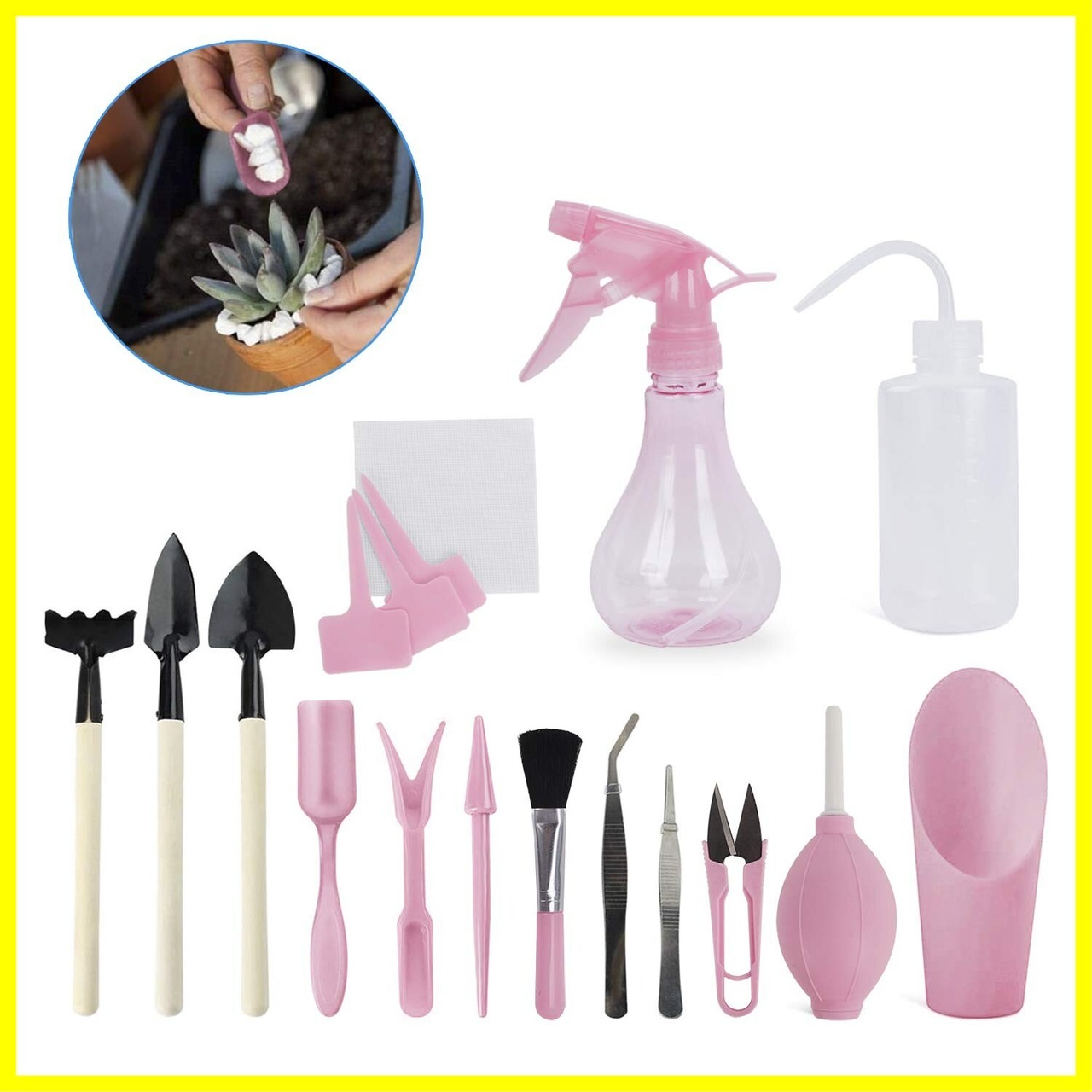様々なツール、レーク、シャベル、水さしボトル、バレル、移植ツールなどを含まれています。雑草、掘削、移植、水遣り、土壌の緩みなど、あらゆる種類の園芸作業を行うことができます。セット:水さしボトル1個、プラスチックバケツシャベル1個、反り口ドリップボトル1個、ミニ幅広スコップ1個、ミニ熊手1個、ミニ細長スコップ 1個、ネットマット*3、T字型ラベル*3、エアダストブロワー1個、芽生えツール1個 、ホールパンチャーツール1個、スクープツール、1個移植ツール1個、反り先端ピンセット1個、プラスチッククリーニングブラシ1個、小さなハサミ3個。