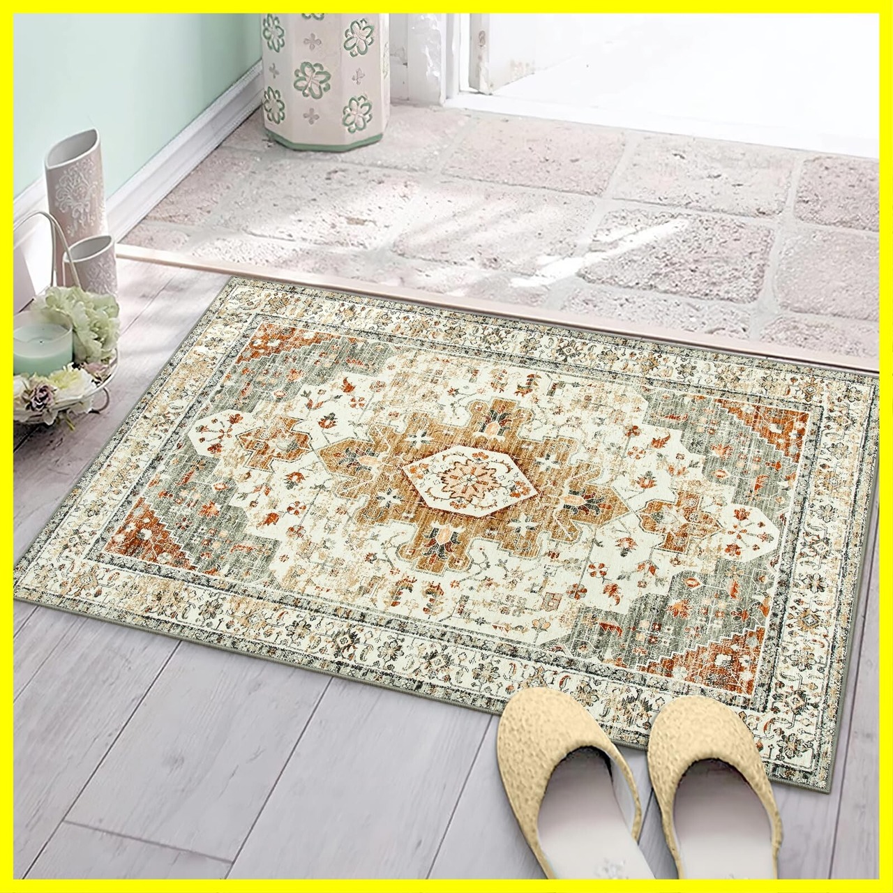 HAOCOO 玄関マット 室内 ペルシャ風 ラグマット 洗える 50х80cm 小さい おしゃれ 長方形 滑り止め 防音 屋外 泥落とし アンティーク オールシーズン適用 耐磨耗性 薄手 メダリオン柄 カーキ