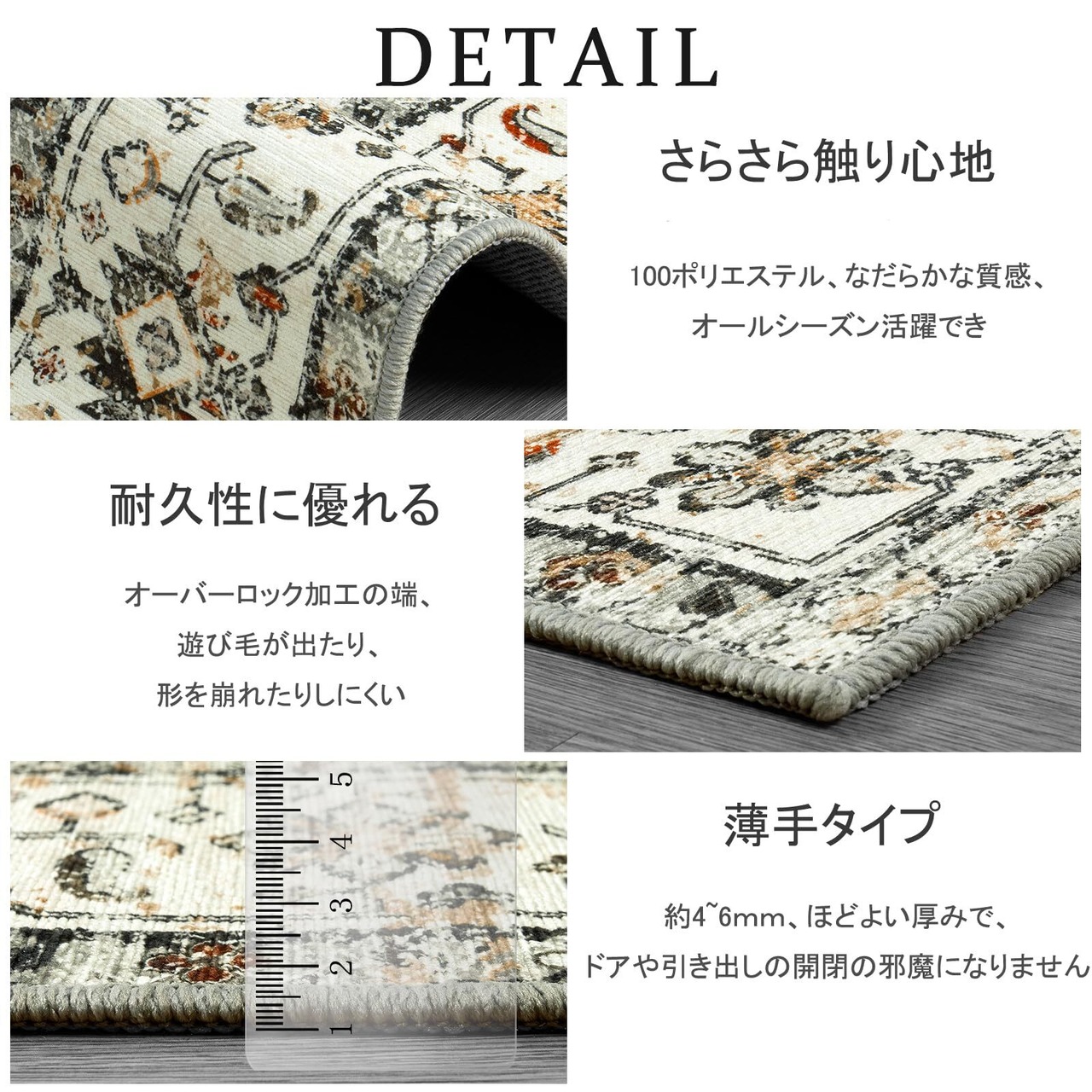 【商品仕様】サイズ:50×80cm、厚さ:約4~6mm(薄手タイプ)。表面素材:100%ポリエステル、裏面素材:TPE(滑り止め加工)。オーバーロック加工の端、遊び毛が出たり、形を崩れたりしにくい。梱包:折り畳み。※梱包により生じた折り目は時間の経過とともに平らになります。 上に重いものを置くと、カーペットのしわが早く消えます