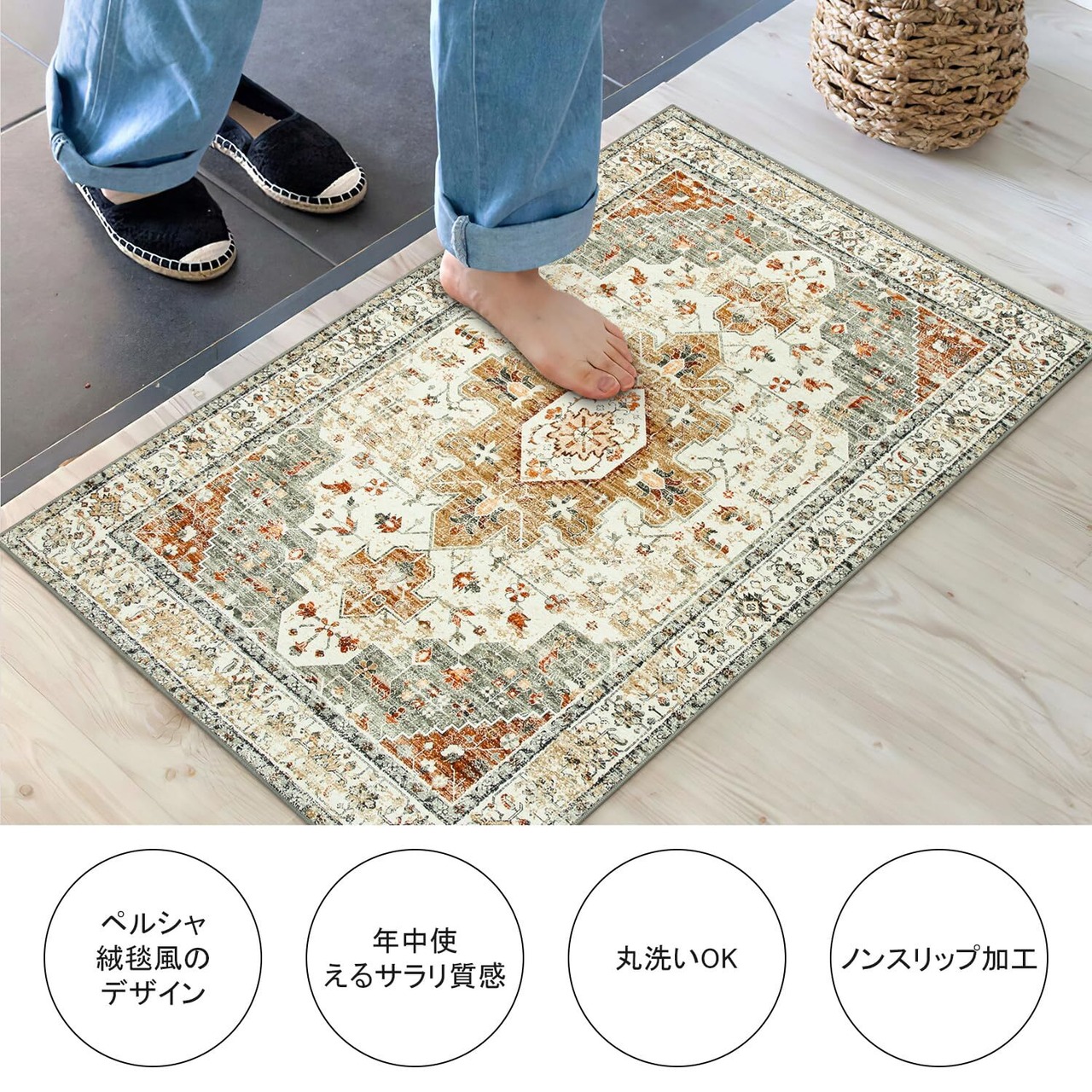 【多用途デザイン・幅広いシーンで活躍】精密機械織りで耐久性に優れ、床を保護しながらインテリアとしても最適。玄関マットとしてはもちろん、ベッドサイド、ベランダ、テーブル・椅子・化粧台の下など、さまざまな場所で足元を快適にサポートします。お部屋のアクセントとしてもおすすめです
