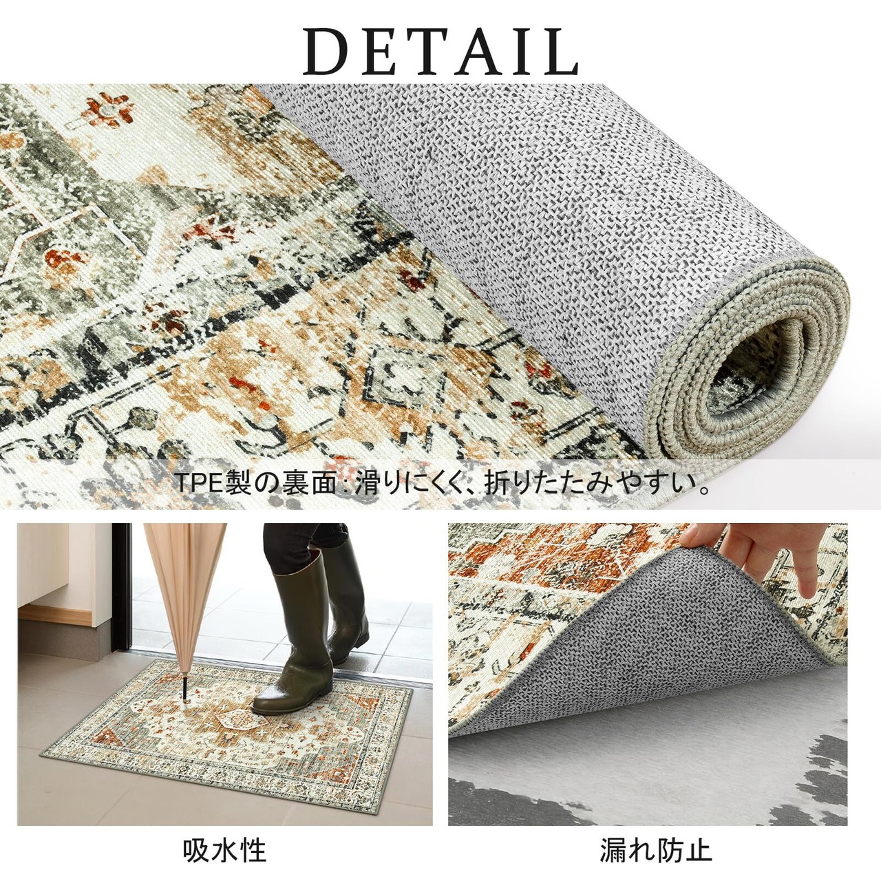 【特徴】TPE製の裏面は、通常の不織布製裏面よりも強力な滑り止め効果を発揮します。高齢者やお子様、ペットのいるご家庭でも安心してご使用いただけます。吸水・防音・防ダニ・抗菌・防臭仕様で、快適な使い心地を提供します。折りたたみや持ち運びが容易です。また、ペットに優しい素材と仕様となっており、ペットの爪や毛などにも耐えるように設計されています