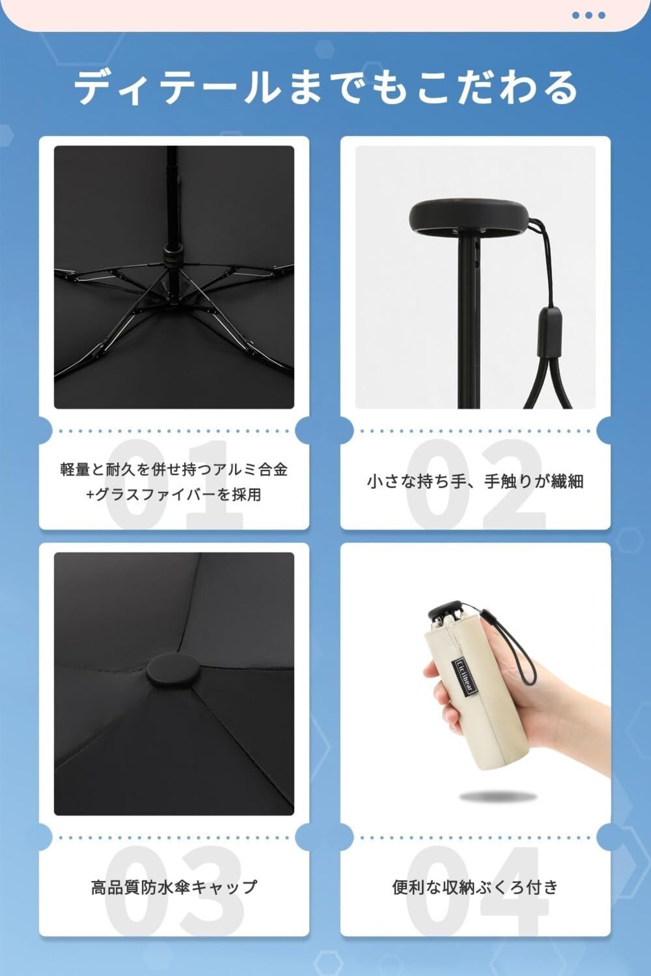 【優れた耐久性・耐風性】アルミ製の中棒とグラスファイバー製の傘骨5本を合わせて使用しており、軽量なのに耐久性があります。適度な厚みと弾力性があるので、錆びにくく強度と耐久性に優れています。持ち手は高品質ABS樹脂で作られ、手触りもよくて握りやすい形状で、長時間差しても手首が疲れません。