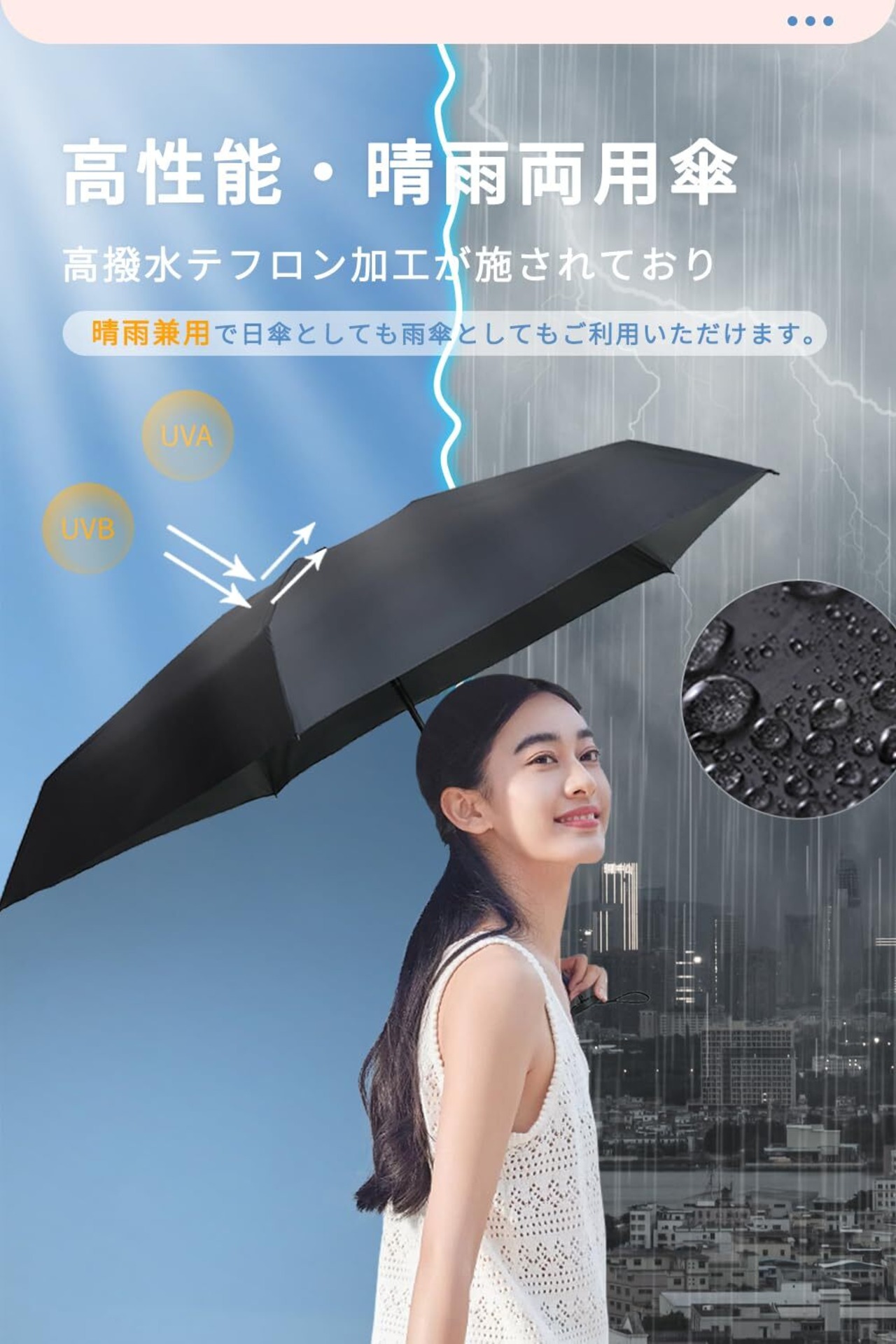 【超撥水加工・晴雨兼用】傘布は高密度のテフロンポリエステル材料で作られ、普通のテリレン製傘より撥水性に優れています。水滴が傘に落ちた瞬間に水玉になり、コロコロと滑り落ちていきます。傘を閉じた後、軽く振るだけで水滴が簡単に振り払えます。雨の日にも晴れ日にも、通年使える折り畳み傘です。