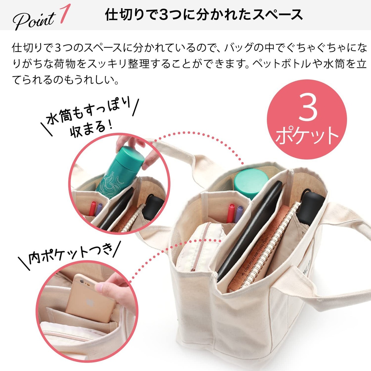 【仕切りがついてすっきり収納】小さめサイズのミニトートバッグに3つ仕切りになった仕切りがつき収納部屋が区分けされスッキリ収納ができます。