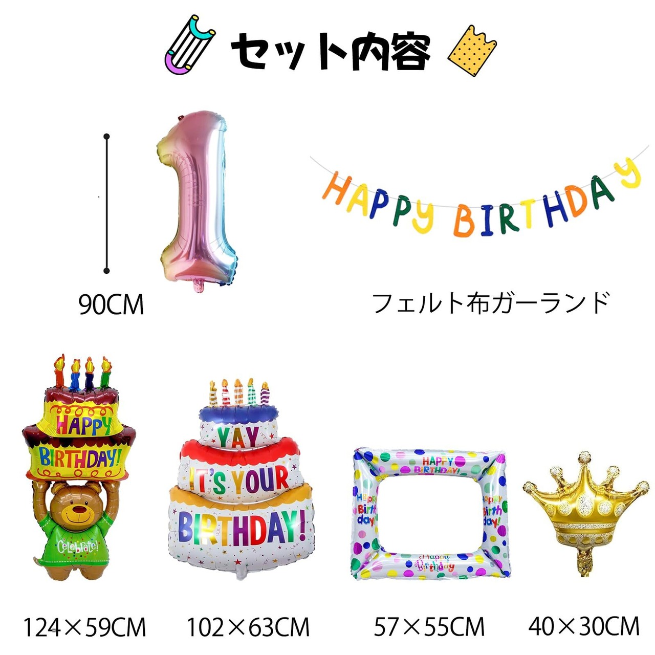【セット内容】①フェルト布ガーランド×1 ②ホイルバルーン×5
