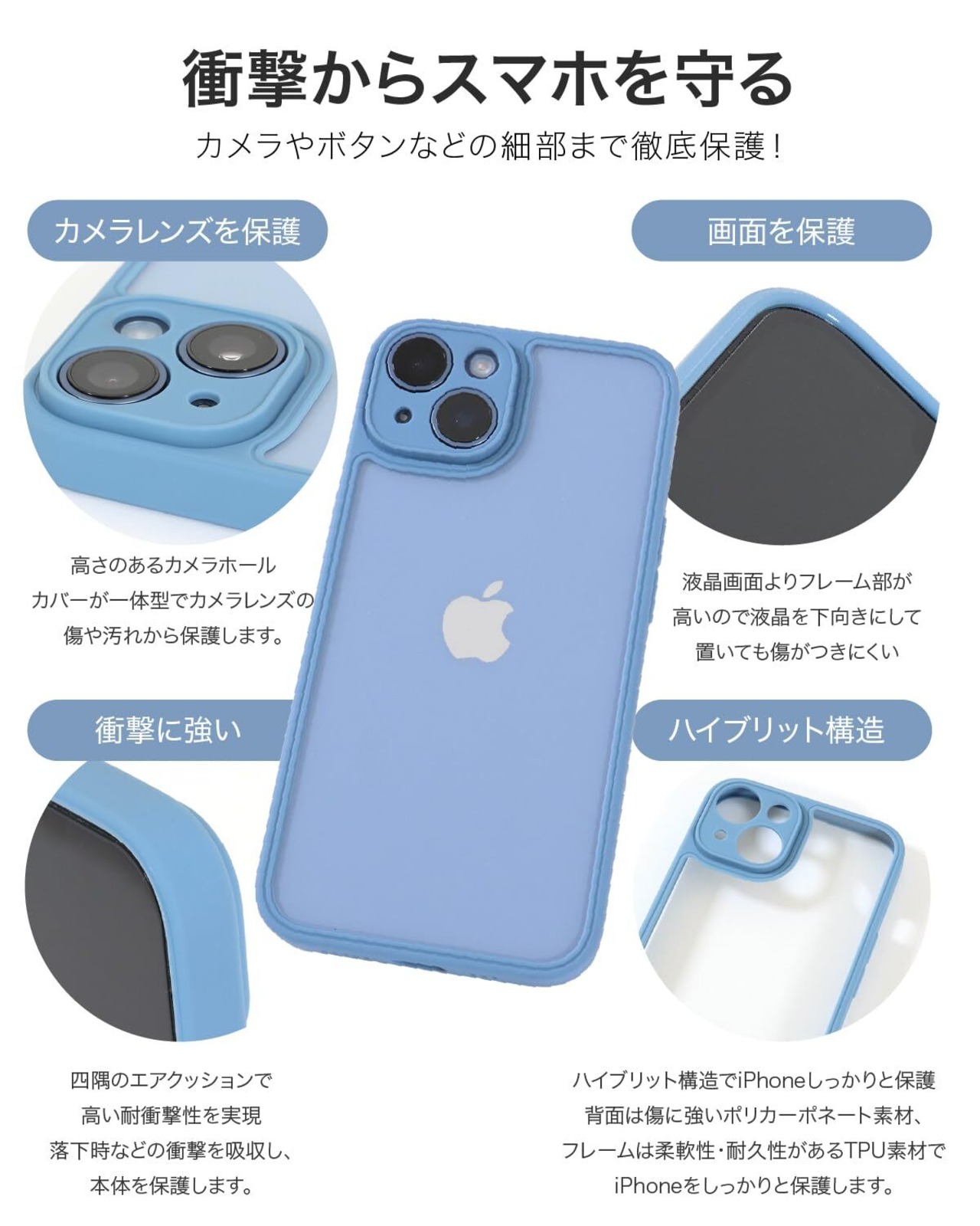 【衝撃に強い】:四隅のエアクッションで高い耐衝撃性を実現。落下時などの衝撃を吸収し、本体を保護します。【画面を保護】:液晶画面よりフレーム部が高いので液晶を下向きにして置いても画面に傷が入りにくい設計です。【ハイブリット構造】:背面は傷に強いポリカーポネート素材を使用、フレームは柔軟性・耐久性があるTPU素材でiPhoneをしっかりと保護します。