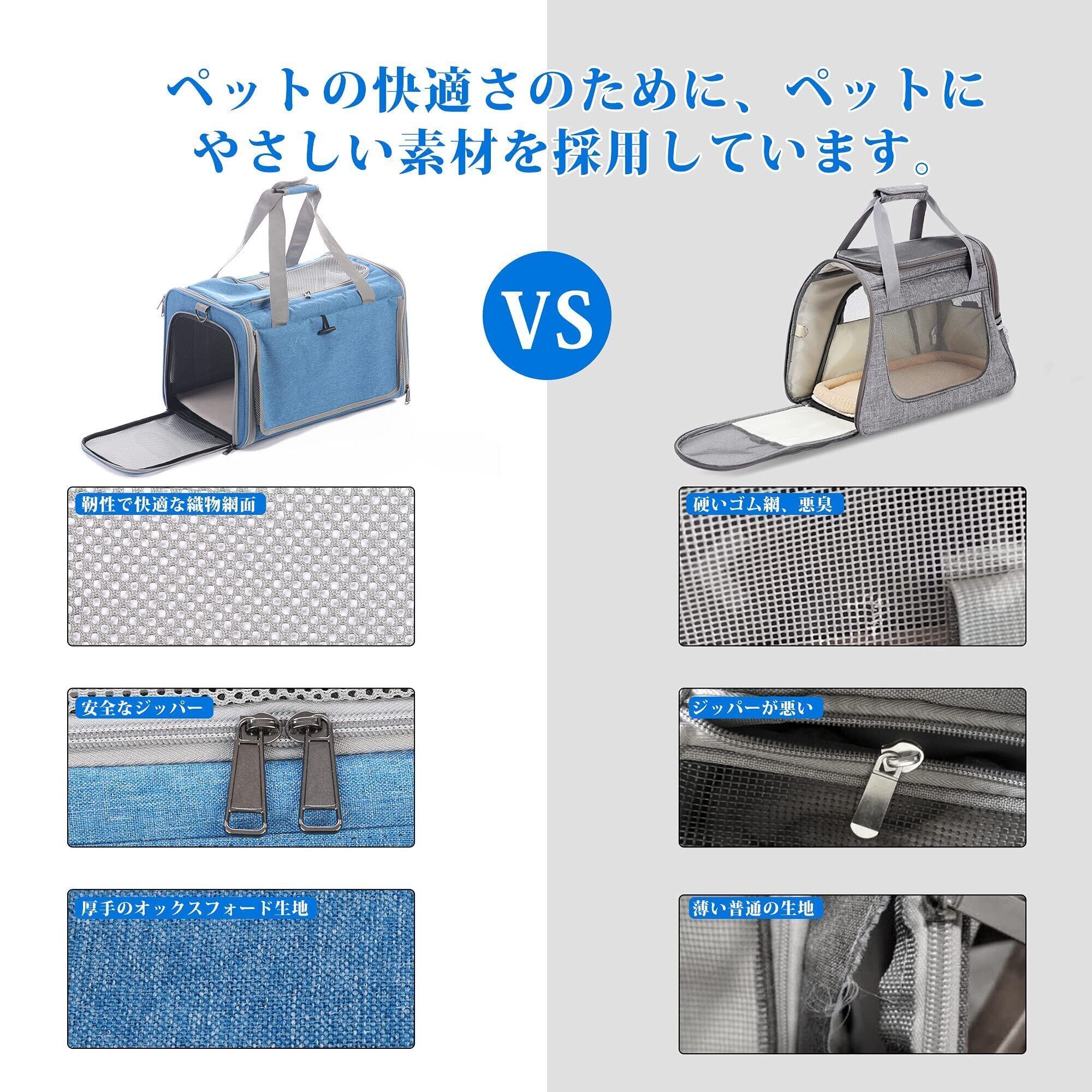 【材質改良】 ペットの安全のために、耐久性のある金属素材を使用しています。ショルダーストラップのフック、ストラップの長さを調整するバックル、飛び出し防止ベルトのフックは、壊れやすいプラスチックのフックではなく、耐久性のある金具を採用しています。壊れやすいジッパーではなく、安全なジッパーを使っています。ペットの快適さのために、ペットにやさしい素材を採用しています。硬い悪臭のゴム網ではなく、靭性で快適な織物網面を使っています。薄い普通の生地ではなく、厚手のオックスフォード生地を使っています。