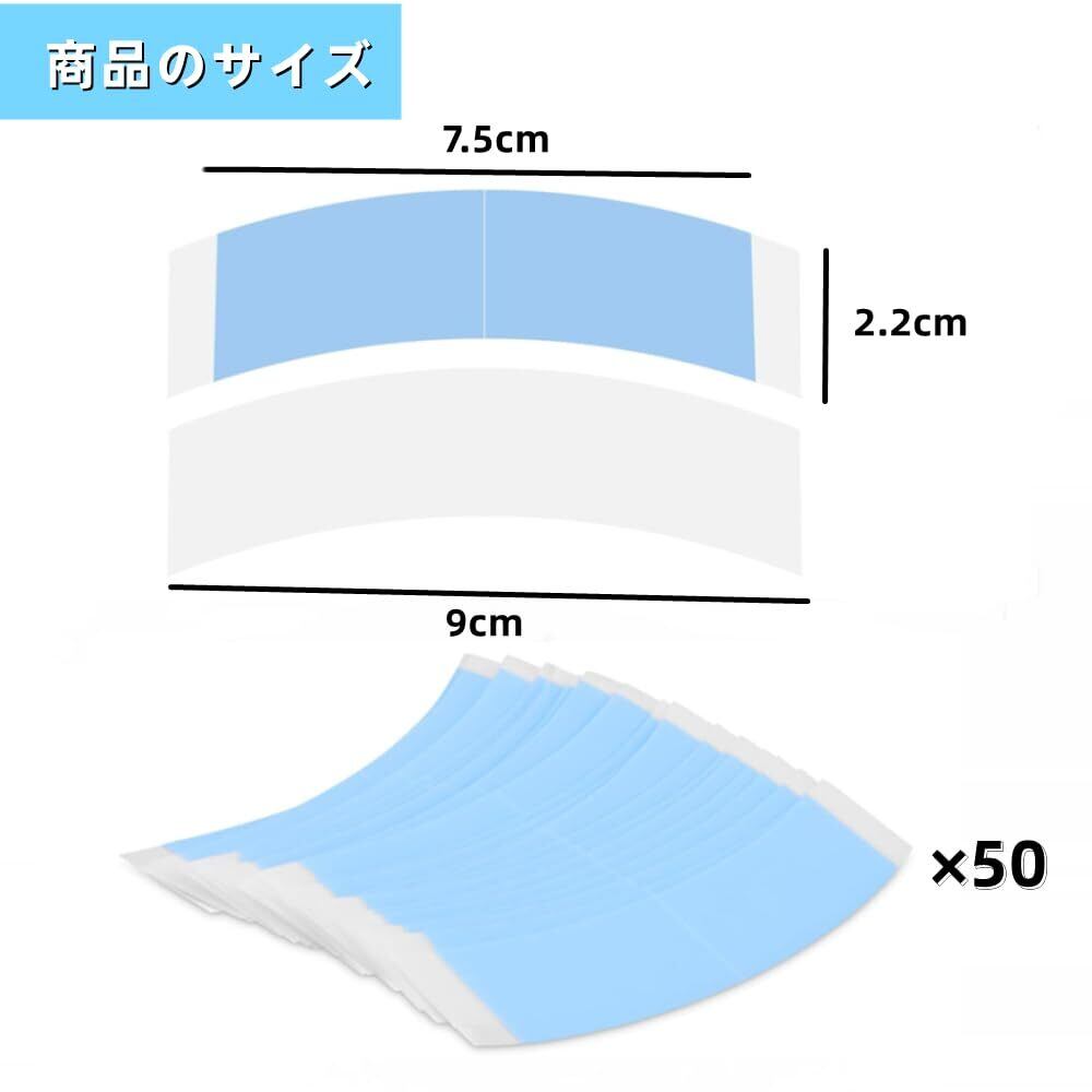 【パッケージ内容】ウィッグフィルム50枚セット、透明。サイズ: 9x2.2cm。 厚さ:0.3mm。透明なテープで、髪本来の色を隠さずに使用できます。