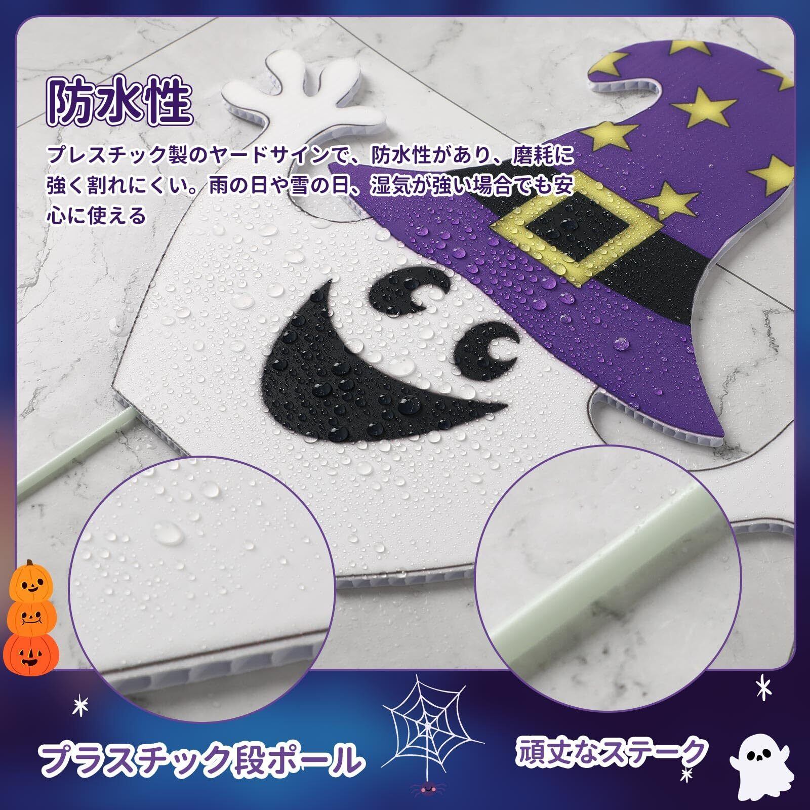 商品仕様:内容:ハロウィン ヤードサイン×8枚 杭×16本;素材:プラスチックダンボール;サイズ:マルチサイズなので、商品画像を参考してください。ヤードサインは劣化や色褪せの恐れがありますので、長時間屋外環境に置くことをおススメしません