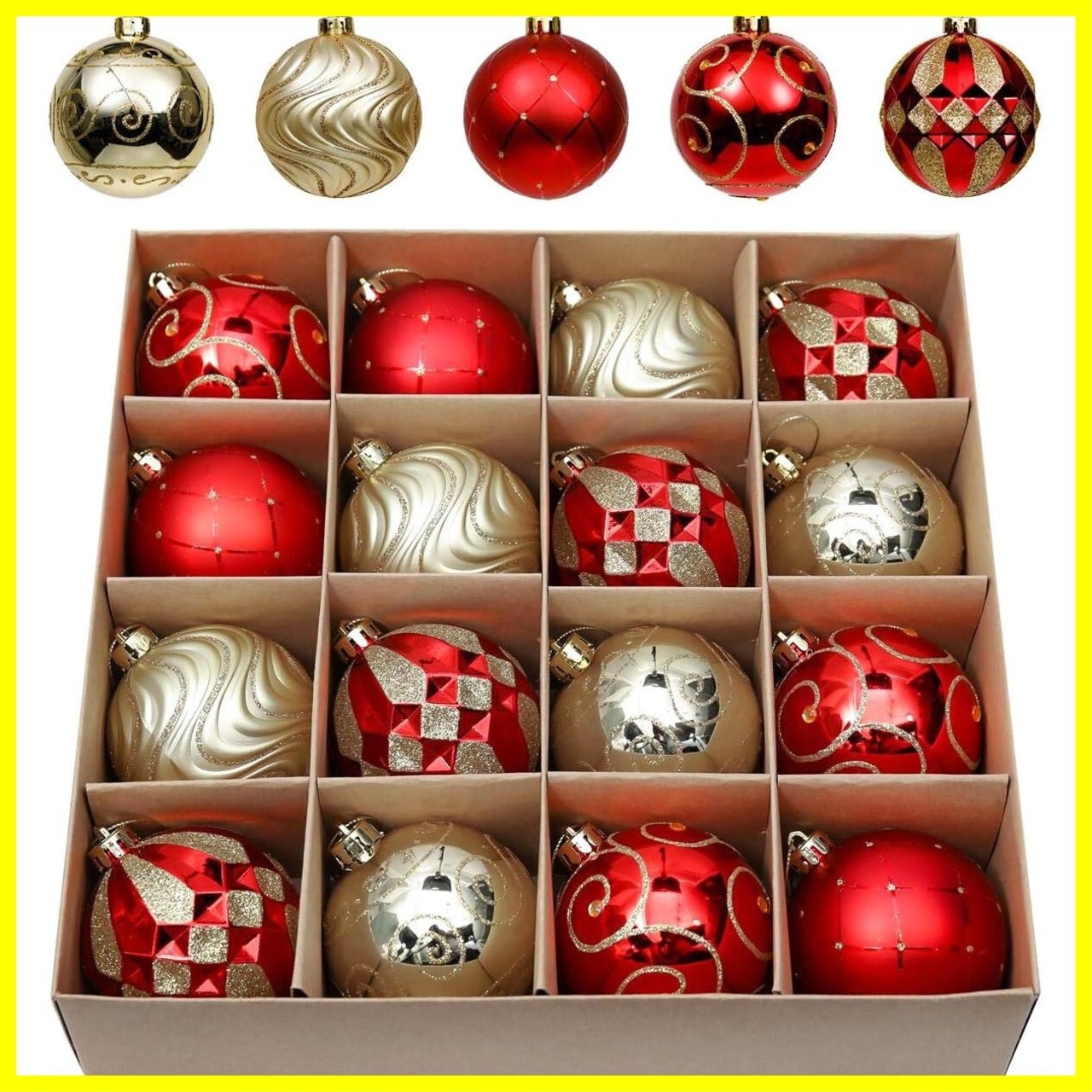 【パッケージとサイズ】クリスマスオーナメントセットには、金、赤のクリスマスボール16個が含まれています。各ボールはシームレス接続を採用し、洗練された外観を作り出しています。ボックスには高品質のエコボール箱を採用し、贅沢感を加えます。