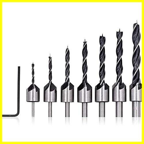 【7種類サイズ&調節可能】:皿穴ドリルビット7本:3mm 4mm 5mm 6mm 7mm 8mm 10mm 付属品:六角レンチ。作業に便利な皿穴ドリルビットの7本セットで六角レンチが付属としてついています。ドリルの長さは、止めねじを緩めて締め付けるだけで様々な長さのねじに対して調整できます。ご注意:ドリルの差し込みがあまい、ドリルの回転スピードが速いケースは軸ズレが生じ易いです。必ず本番前に試して調節をしてからご利用下さい。