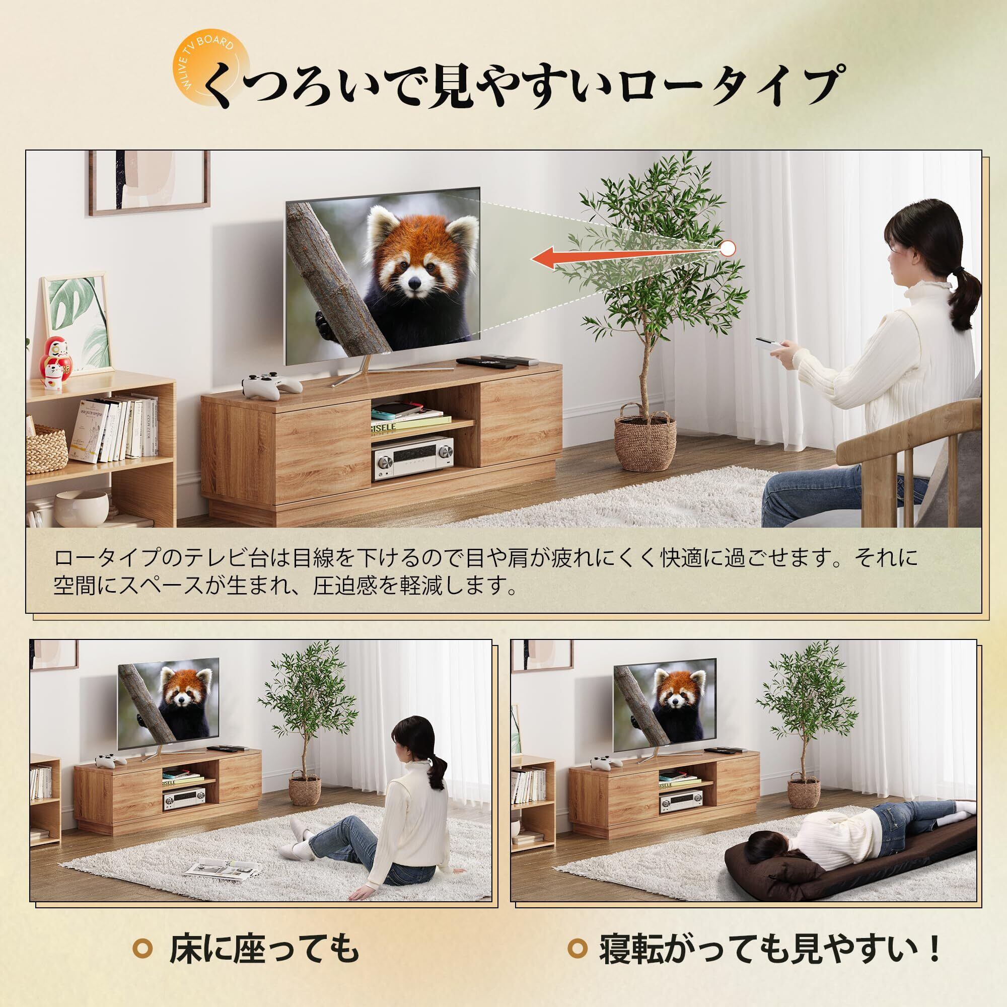 「ロータイプ」コンパクトなテレビ台は、狭いリビングルームでも広々とした空間を演出します。ひとり暮らし用の方にも最適です。テレビを下に置くことで視線を下げ、目や肩の疲れを軽減します。より快適なテレビ視聴が可能です。